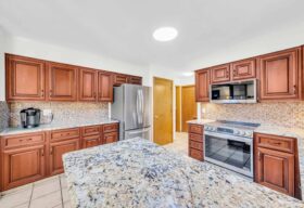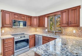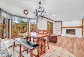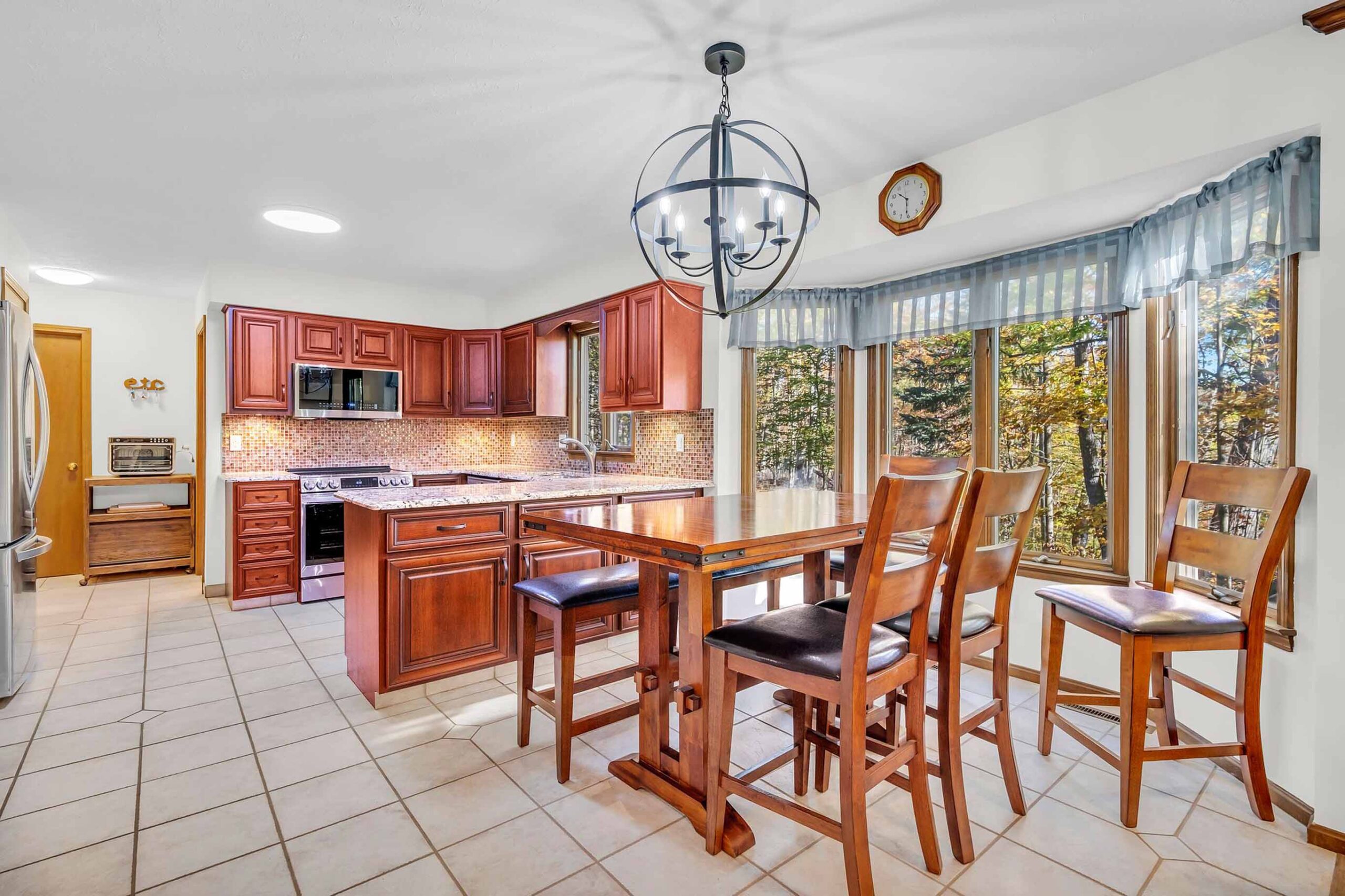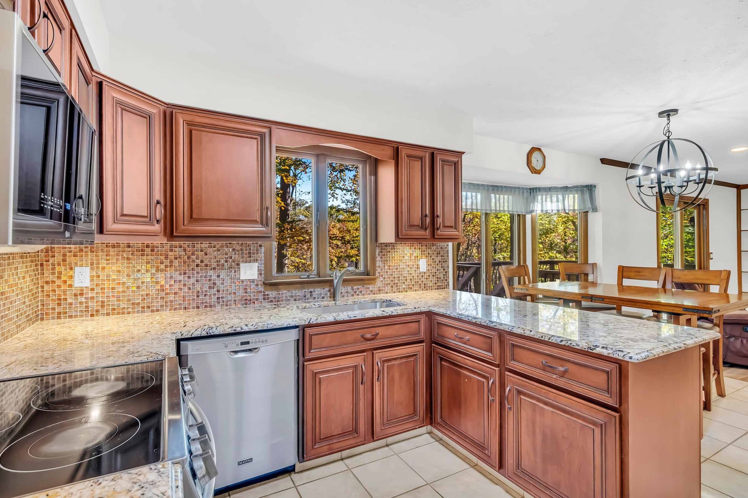 - Adjoining the great room is the beautifully renovated kitchen w/ SS appliances and an open dining space w/bay window overlooking the tree-filled backyard.