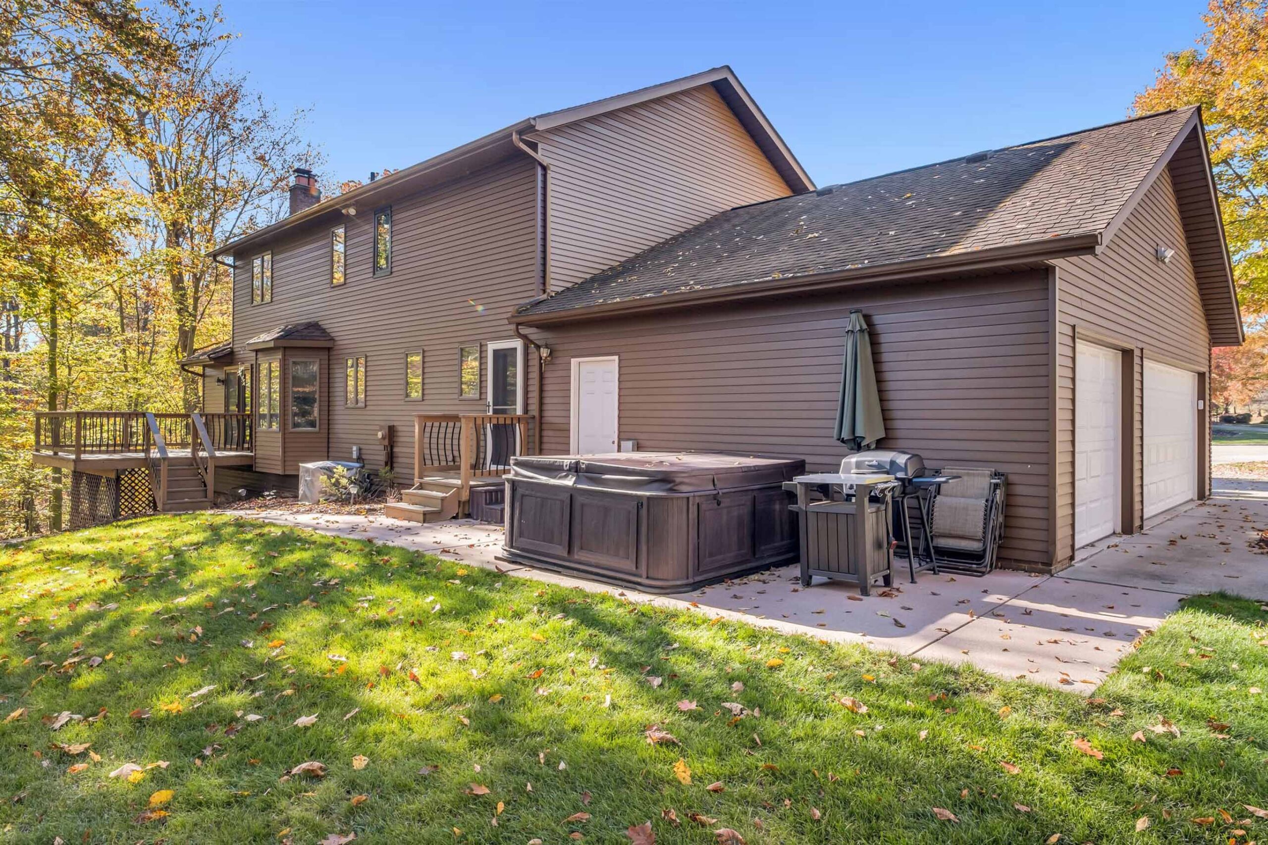 - Step outside and take in the generous private backyard with deck, hot tub and rare level yard space.
