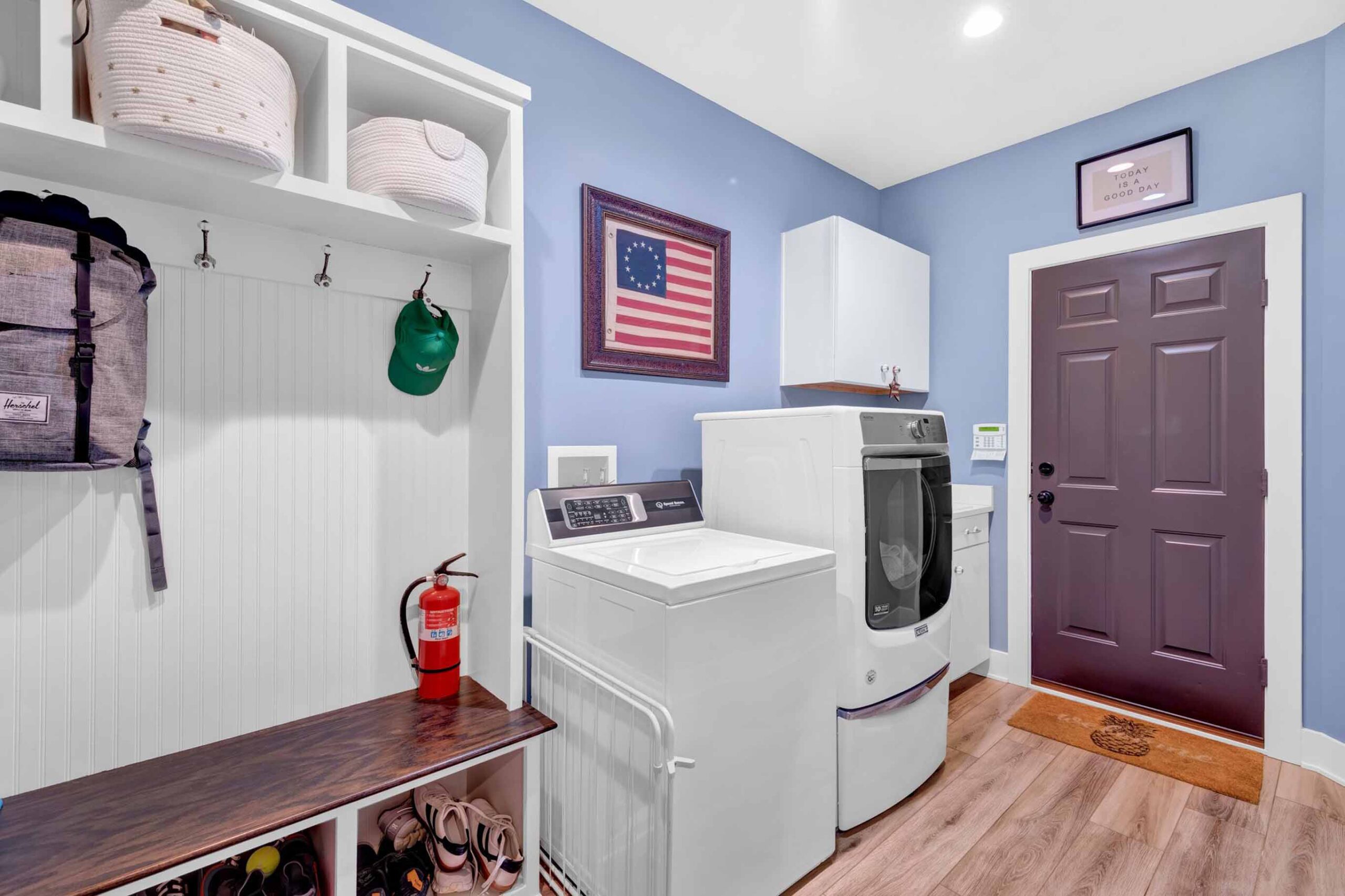 - The laundry room has built-in seating, storage, and beadboard w/coat hooks.