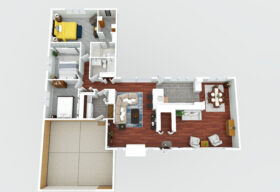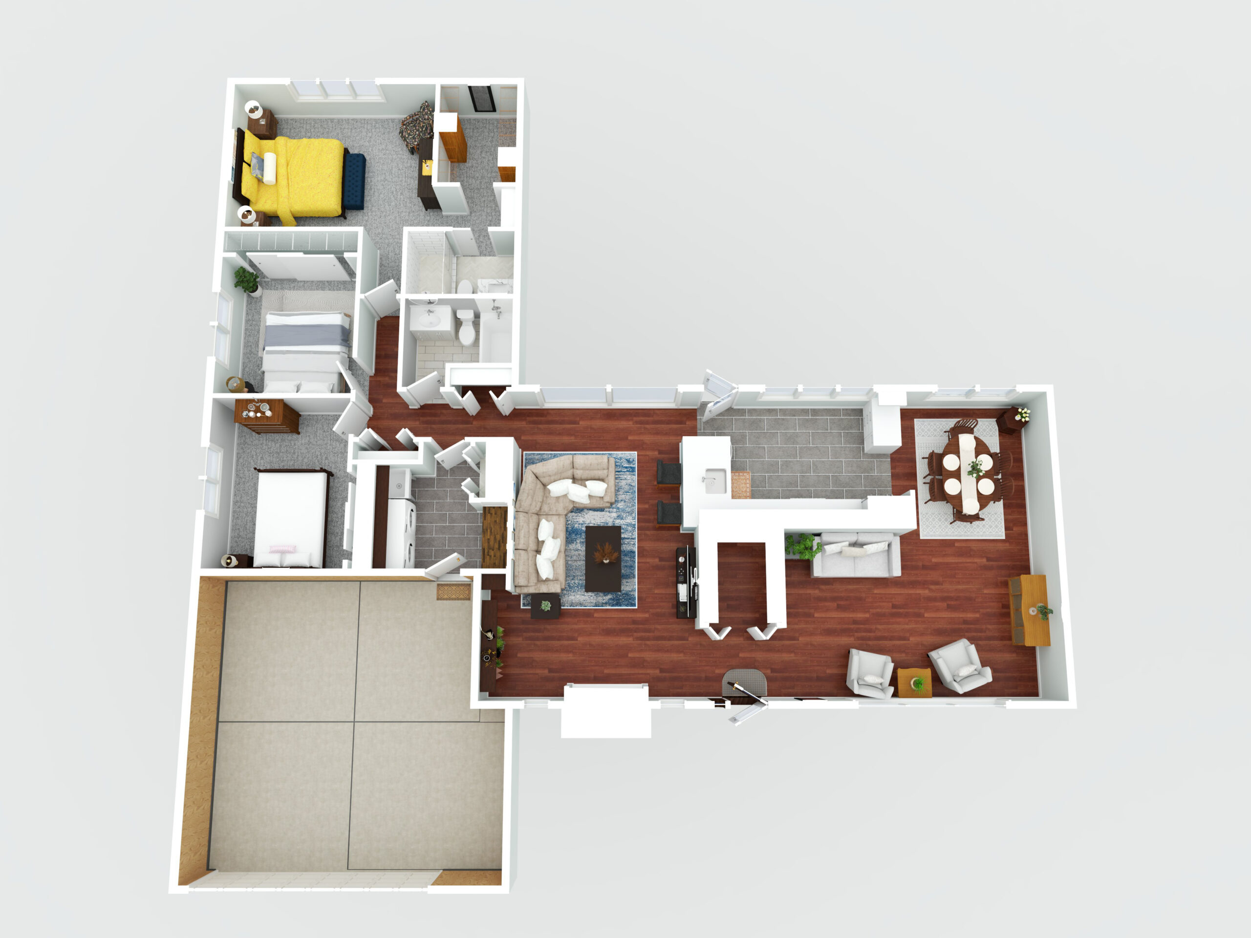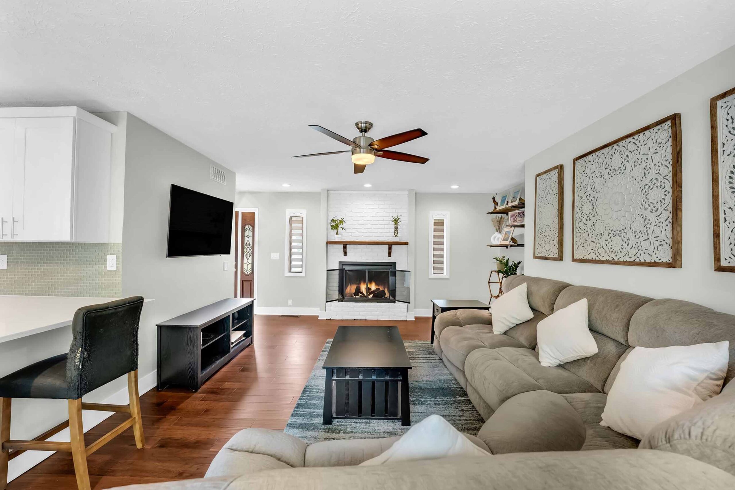 - Engineered hardwood floors flow through the living, dining, and family rooms.