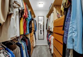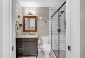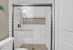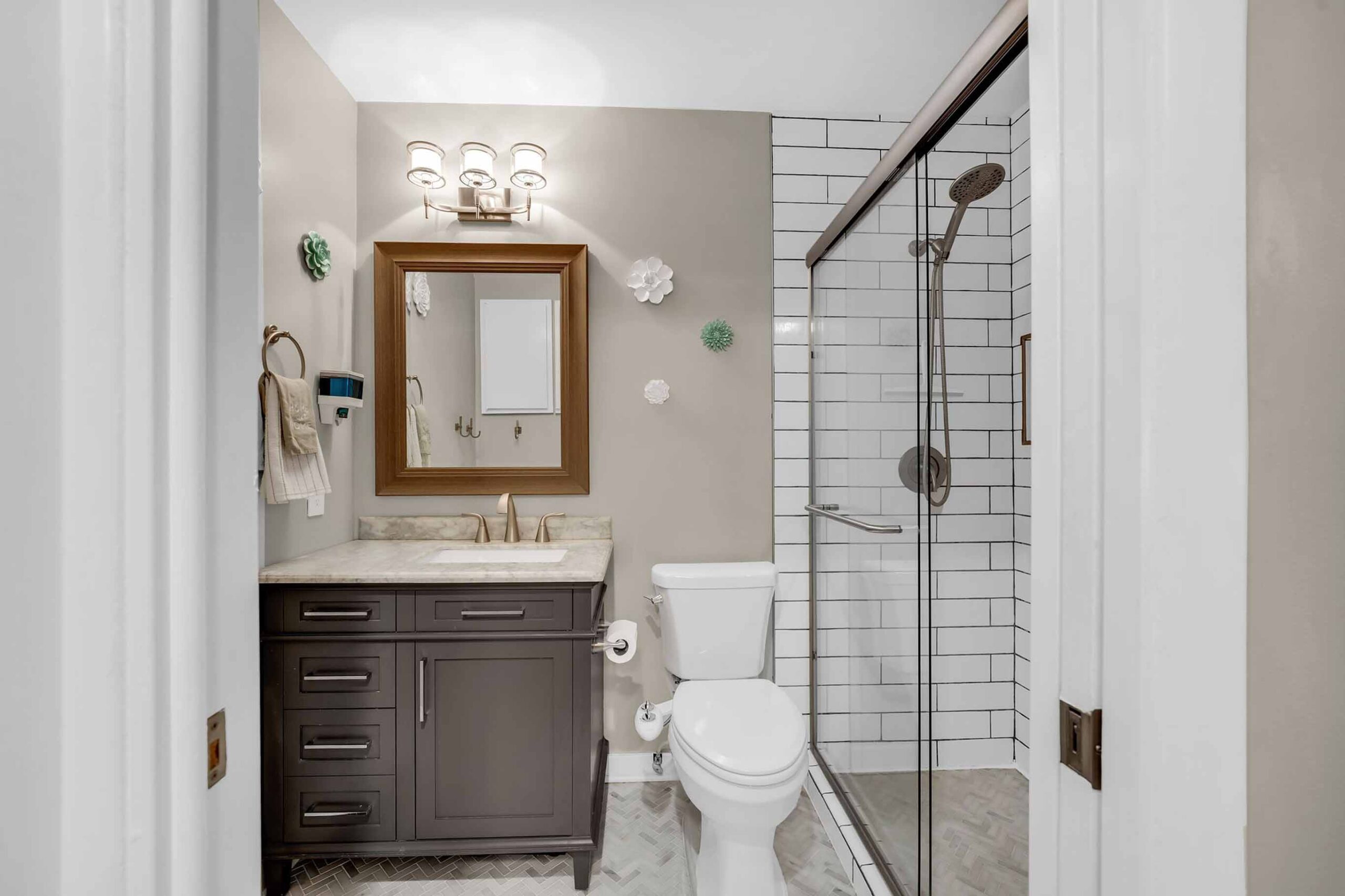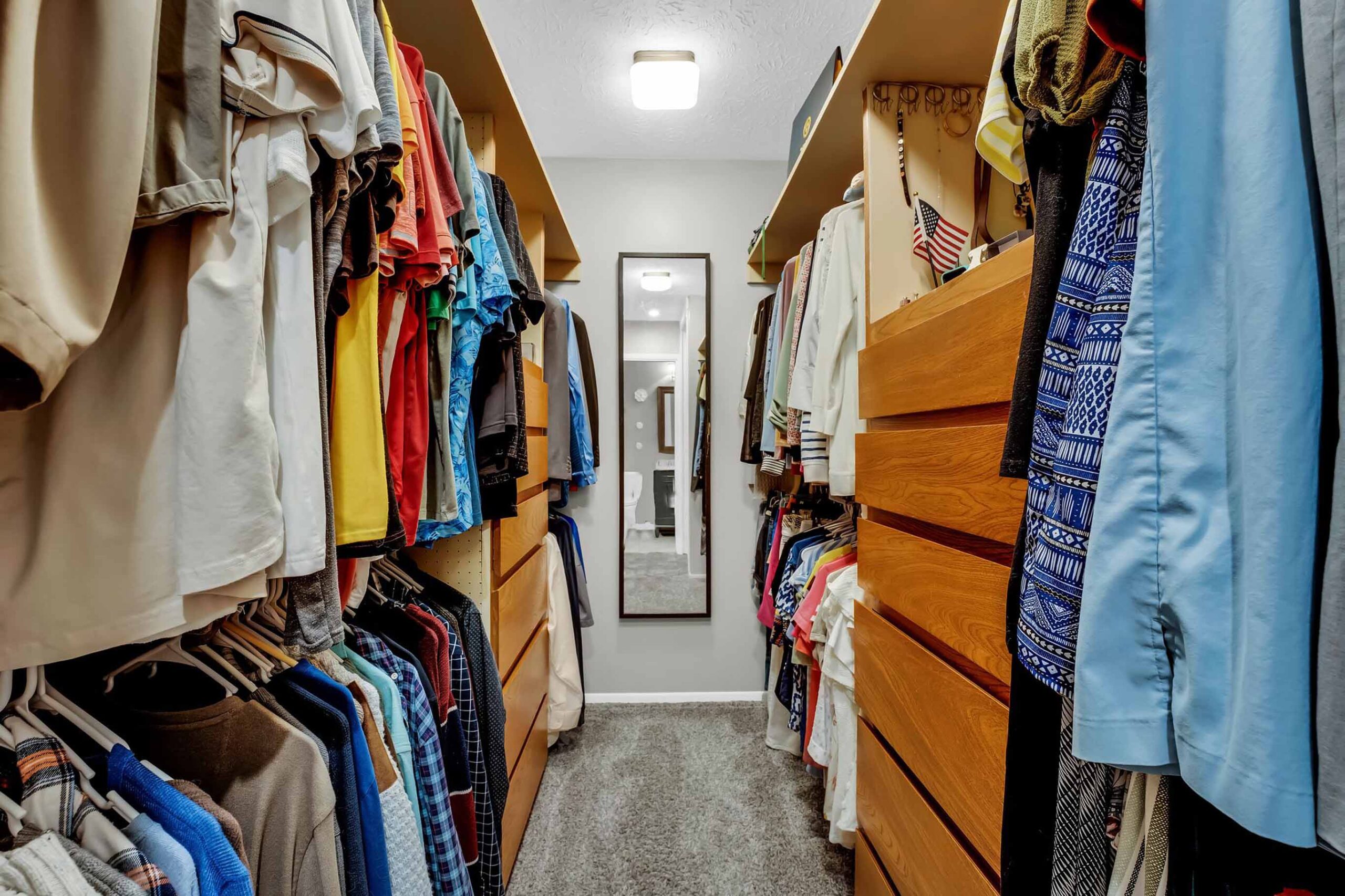 - The primary bedroom features a walk-in closet with organizer and an ensuite bath with a large tiled walk-in shower and storage vanity.