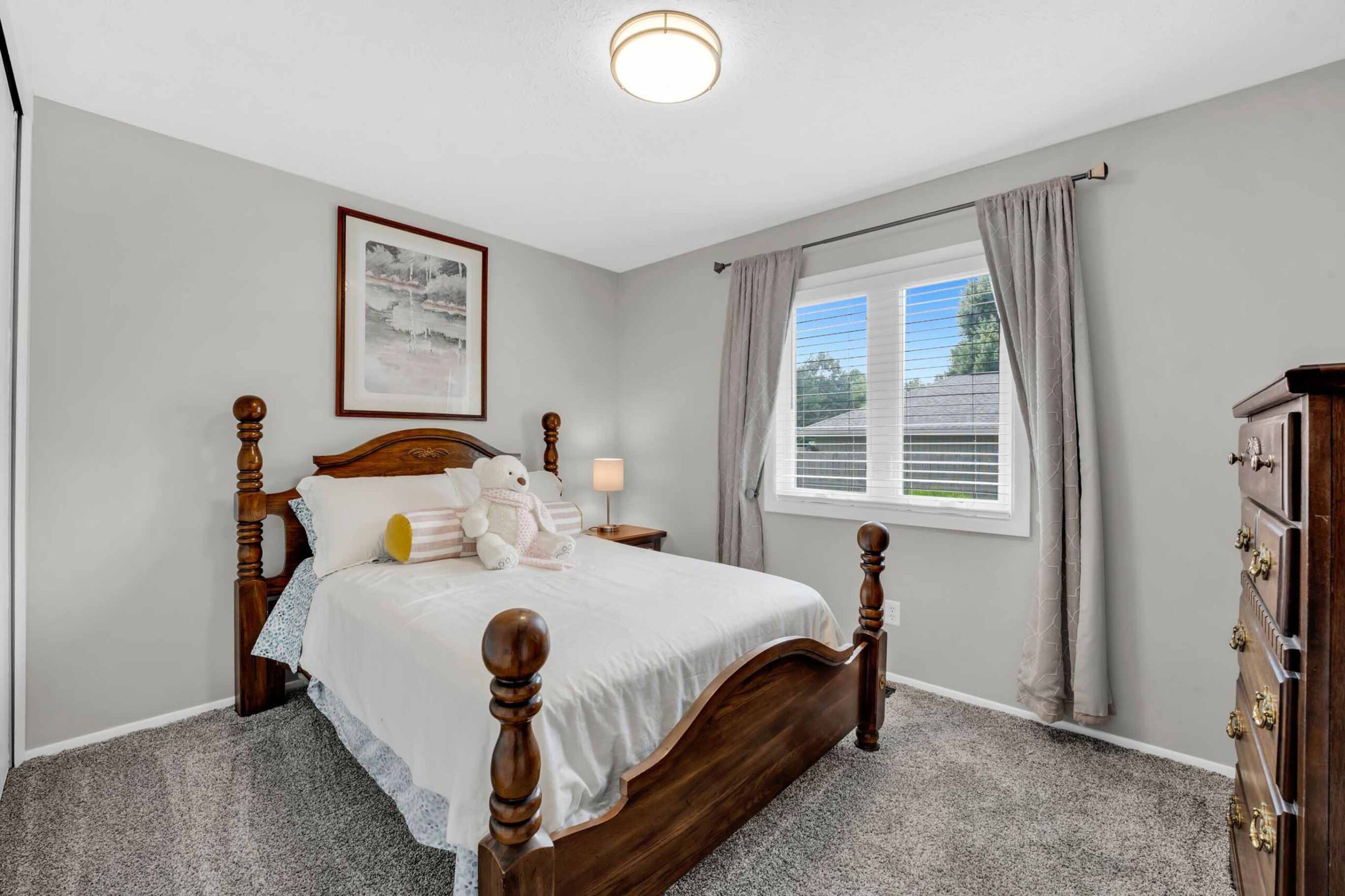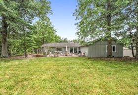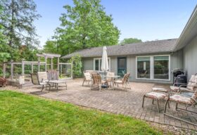 - The wooded, private backyard includes mature trees, an enclosed vegetable garden, and a brick paver patio ideal for relaxing or entertaining.