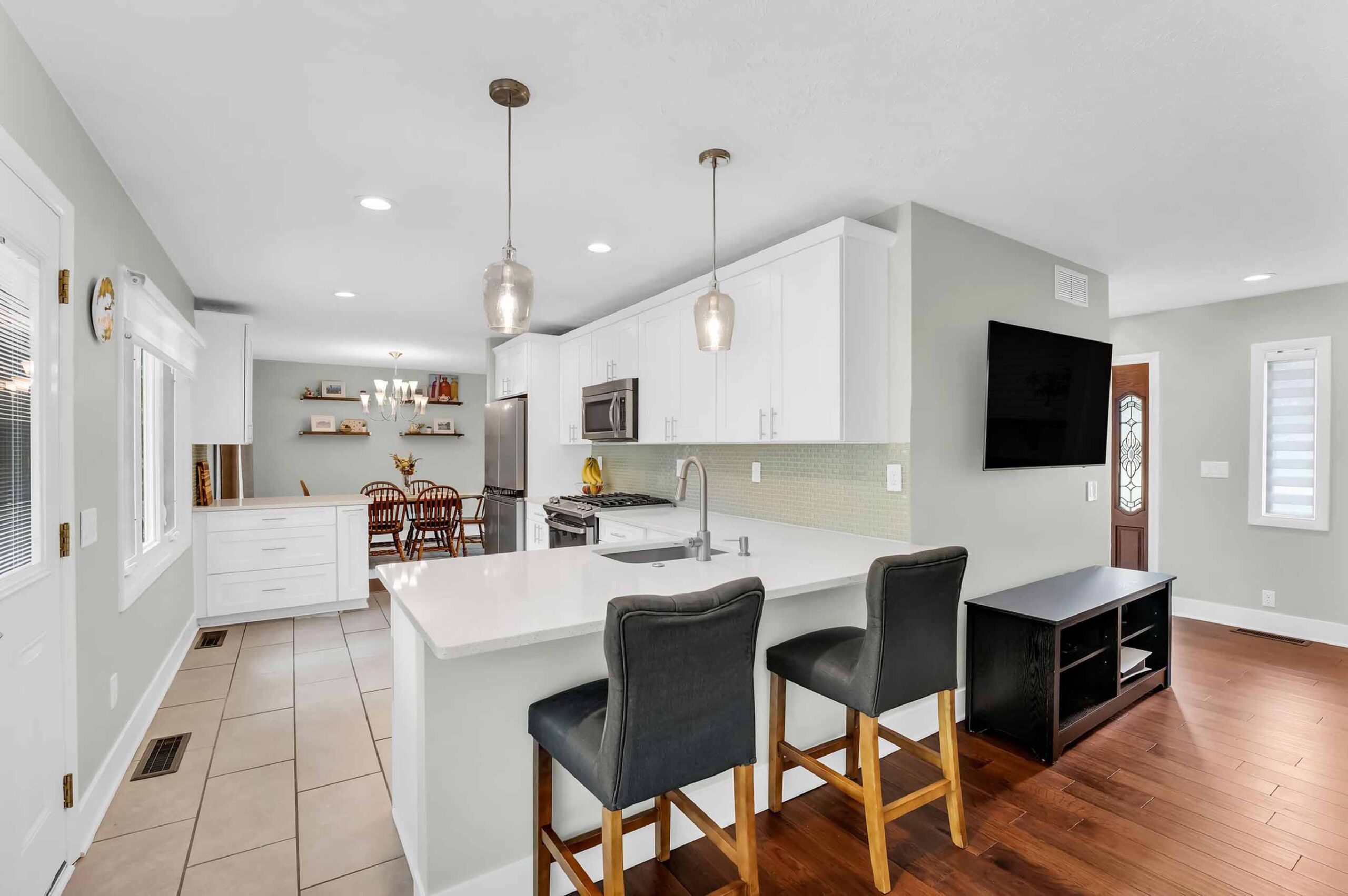 - The updated kitchen features quartz countertops, stainless steel appliances including a range with double gas ovens, counter-depth refrigerator, dishwasher, tile backsplash, recessed lighting, and a two-seat breakfast bar.