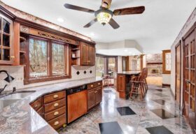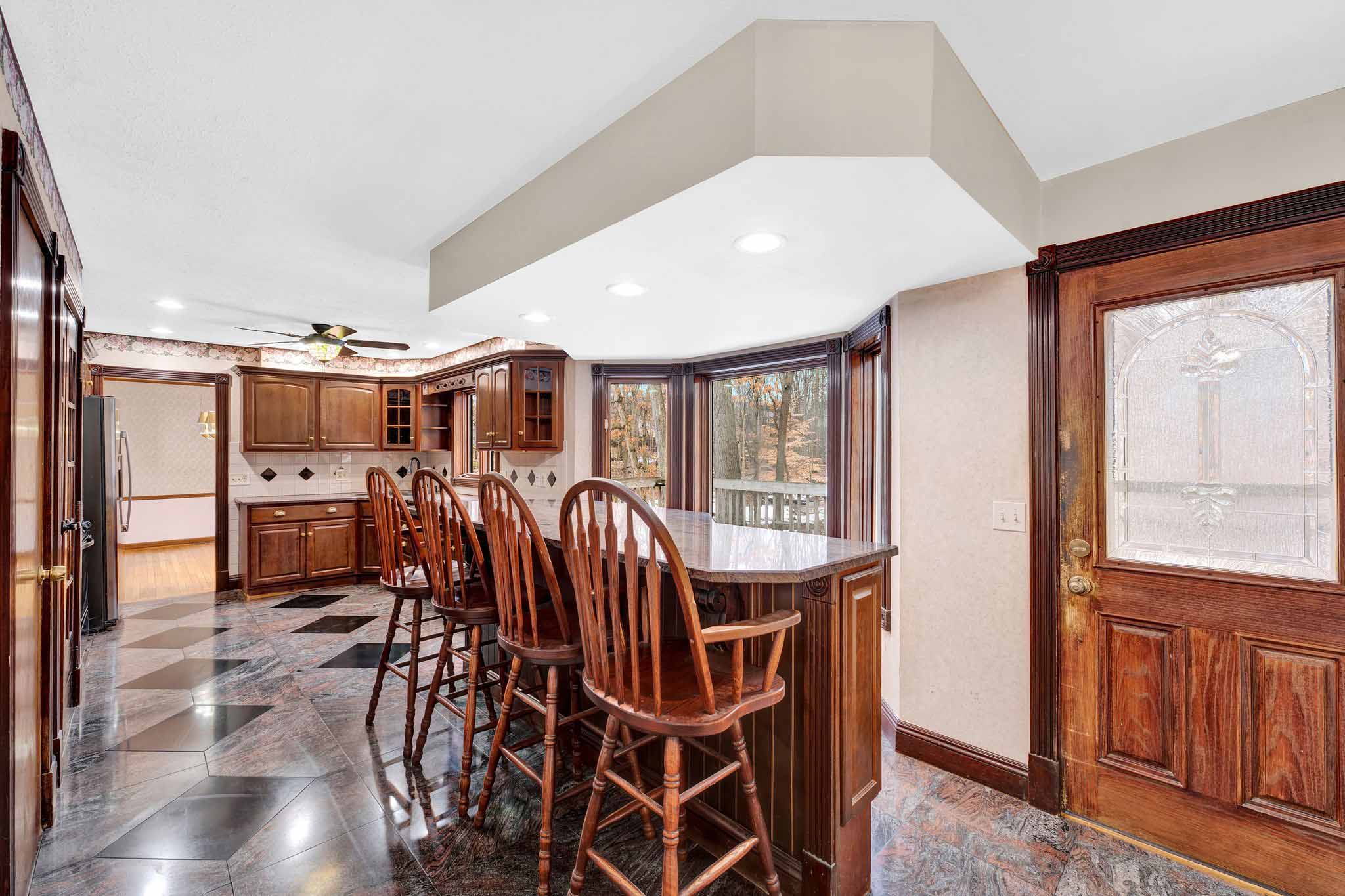 - A huge eat-in kitchen features Schrock cabinetry, granite countertops, and flooring, and an 8’ island w/seating for 4 with scenic views of the backyard including a meandering stream.