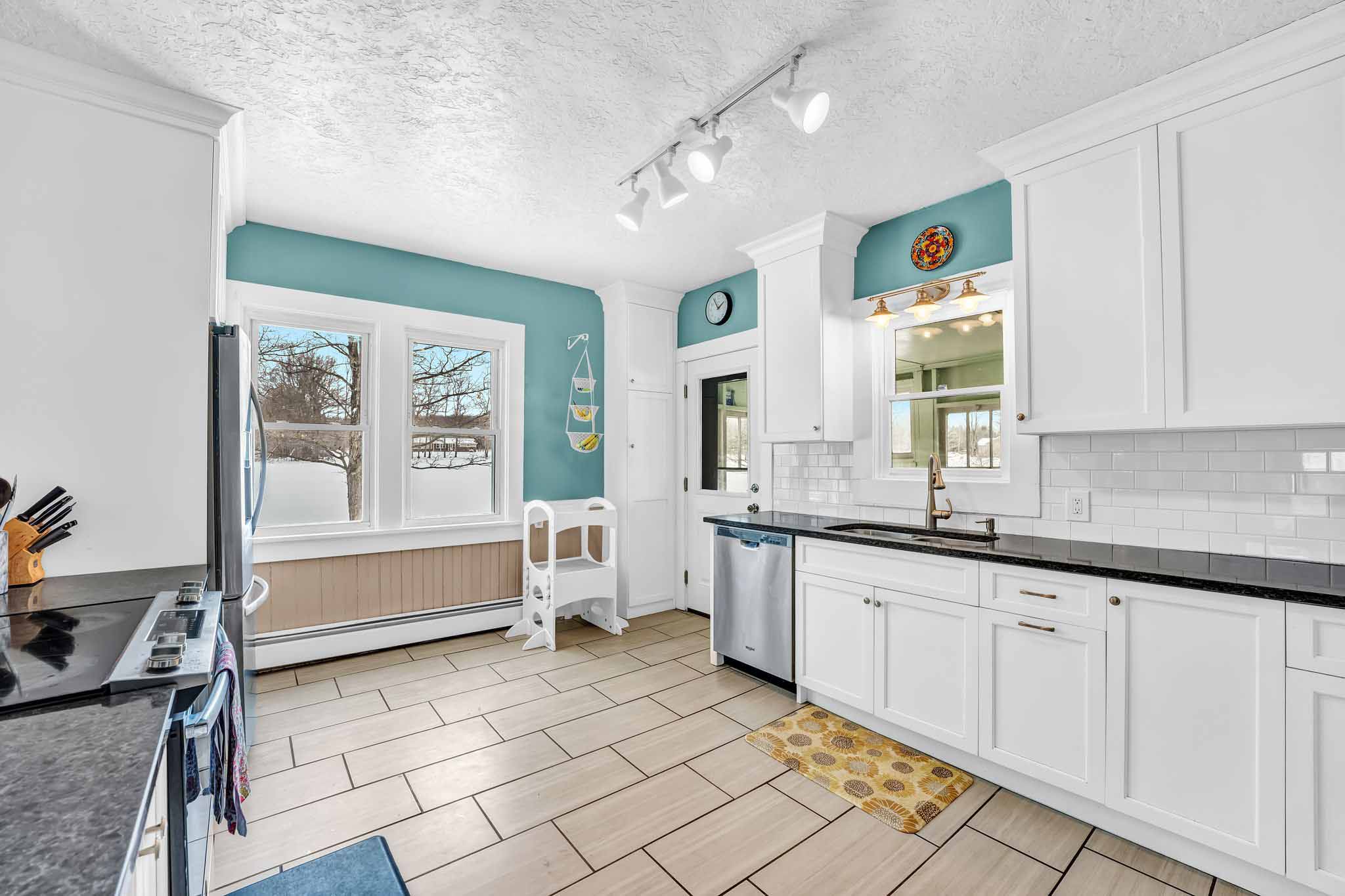 - The renovated kitchen includes high-quality white cabinetry, 42” upper cabinets, granite countertops, subway tile backsplash, & a porcelain tile floor.