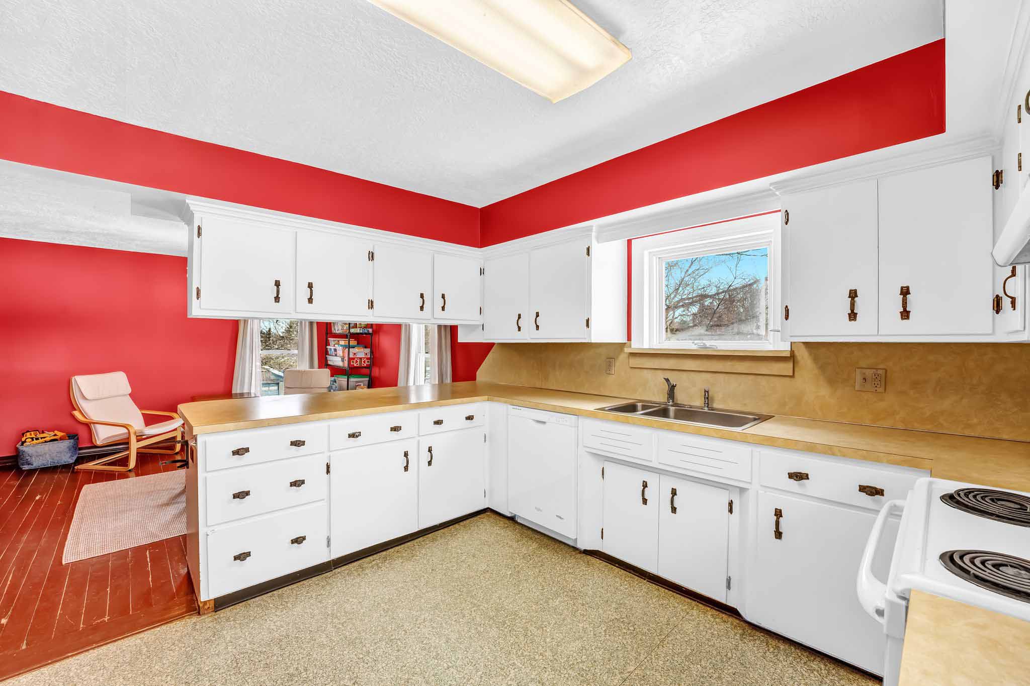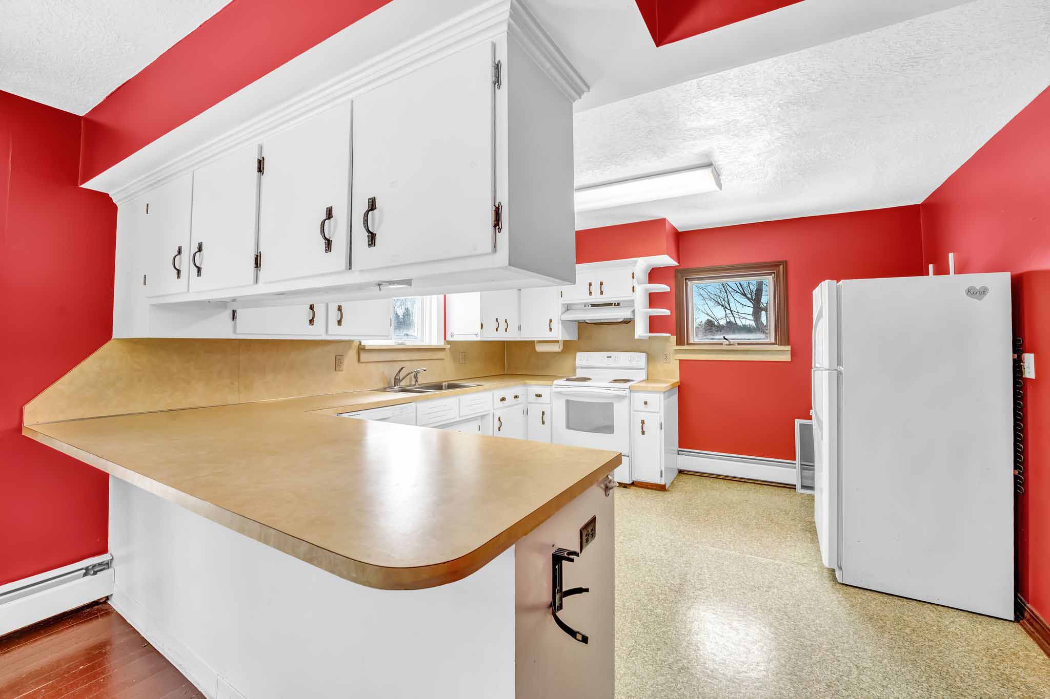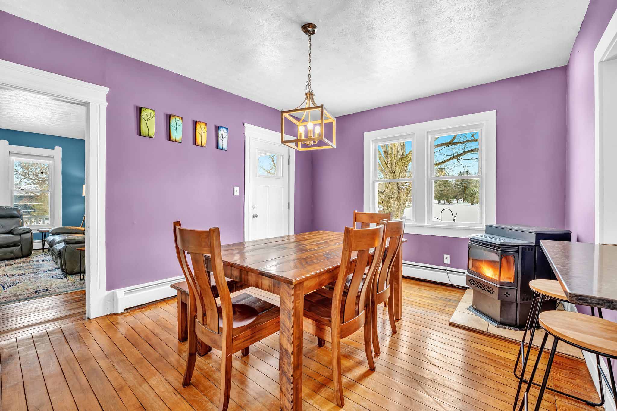 - The kitchen opens into the dining room, which features a working pellet stove & direct access to the front porch.