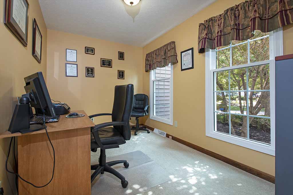 - The main level features three distinct living spaces: formal living room, huge family room with fireplace and a private home office, in addition to a spacious eat-in kitchen, dining room, laundry room near garage and access off the kitchen to a newer private deck.