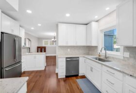 - The 2025 renovated kitchen boasts hickory engineered hardwood flooring, white cabinets (42”, soft-close, dovetailed), granite tops, slate finish appliances, ceramic backsplash & recessed lighting.