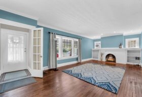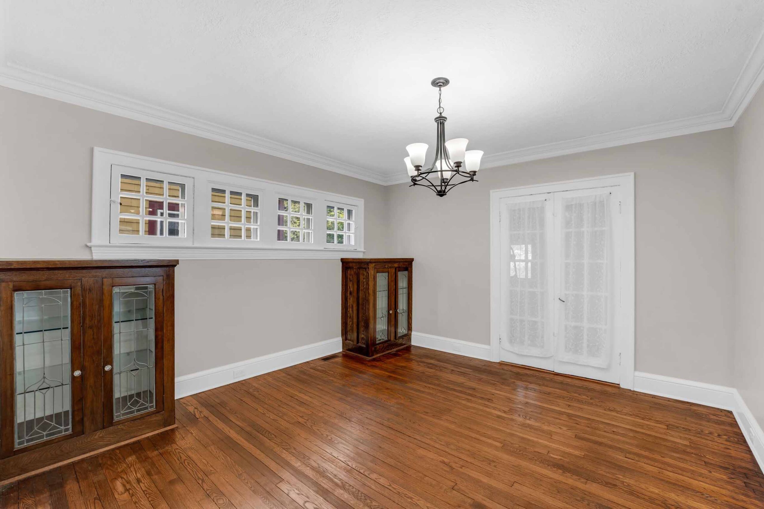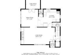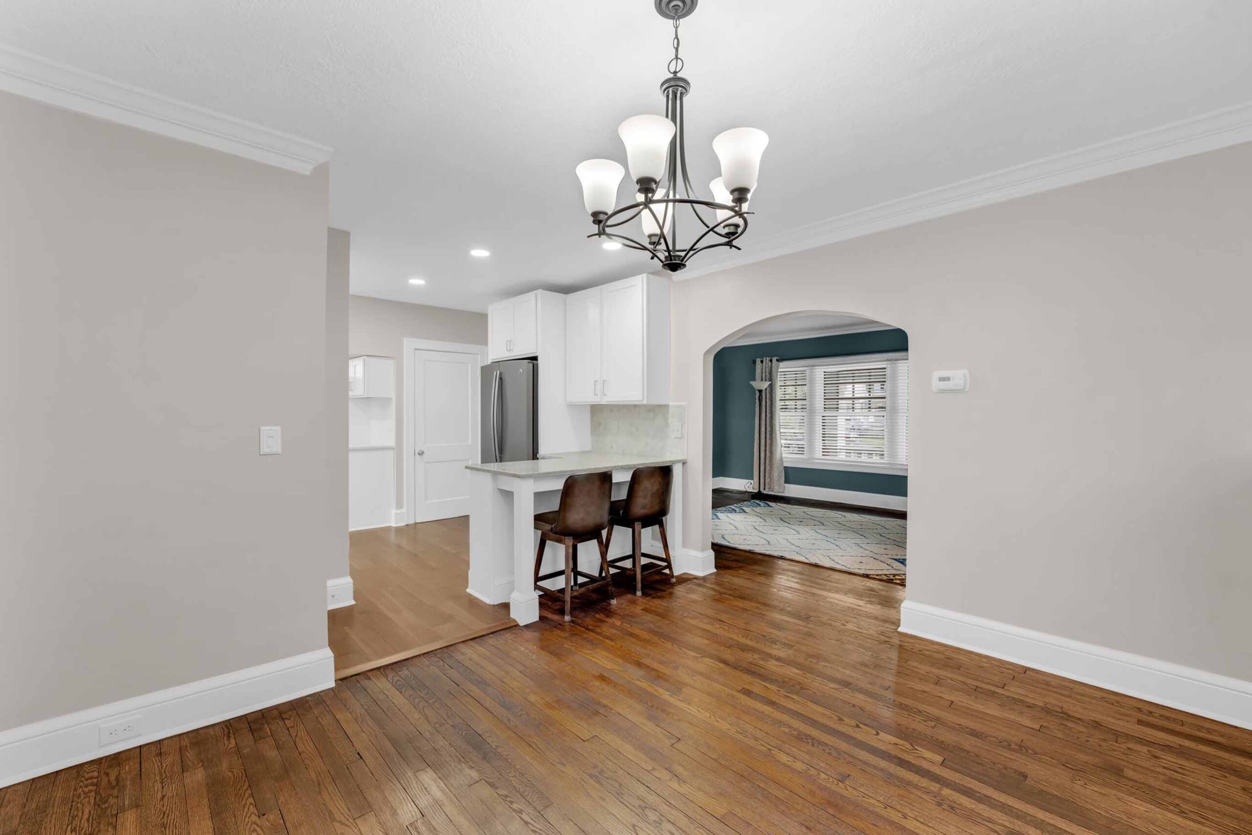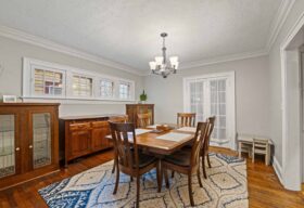 - The dining room presents leaded glass cabinets, an arched opening to the living room, French doors to a private home office, and is adjacent to the renovated kitchen w/a café-style 2-seat bar.