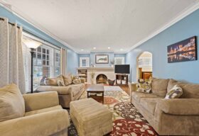 - The spacious, light-filled living room features a curved fireplace flanked by bookshelves and accent lighting.