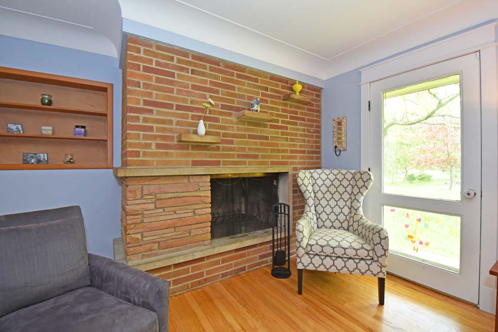 - Spacious main living room with woodburning fireplace and large windows overlooking the private backyard