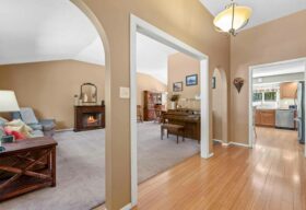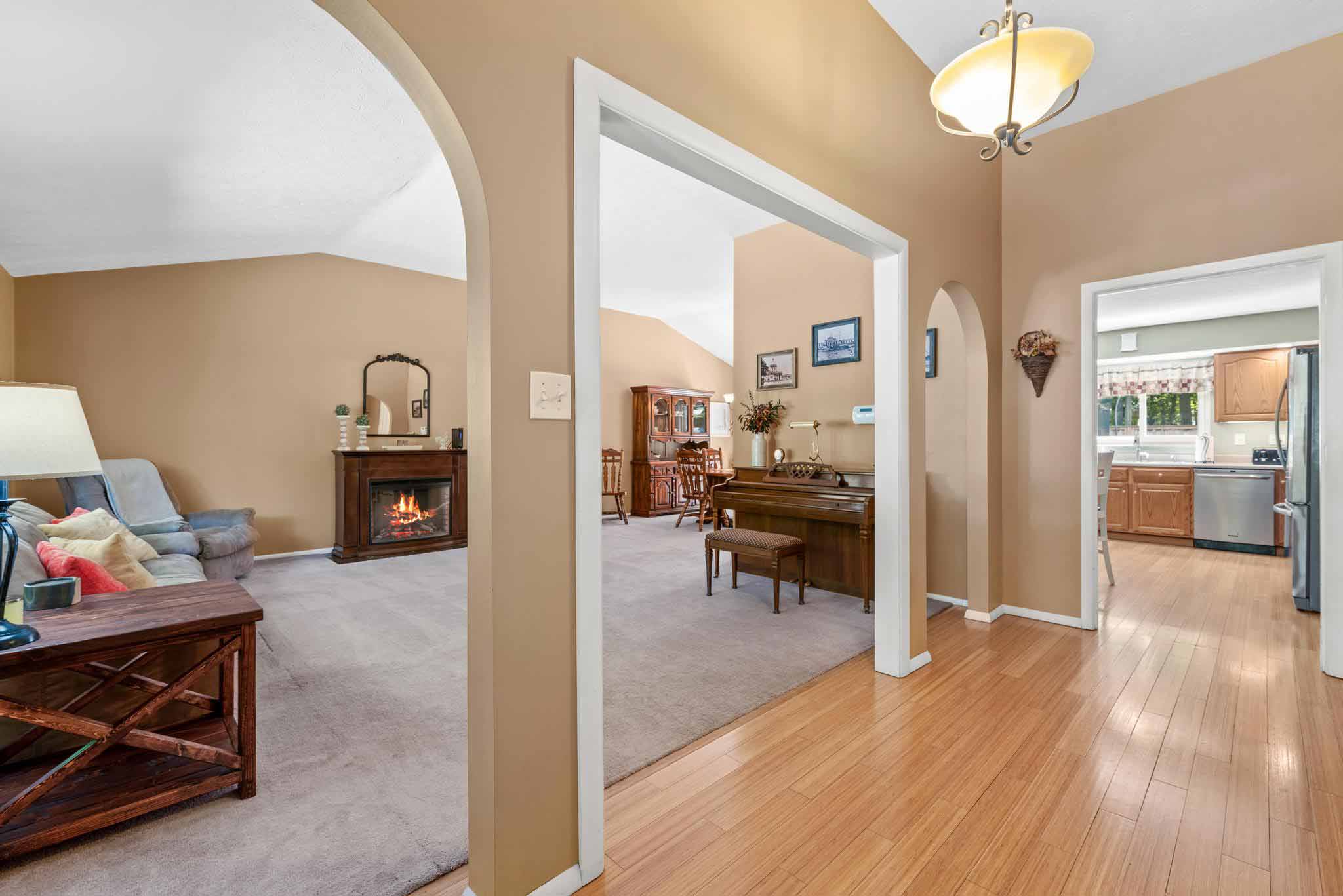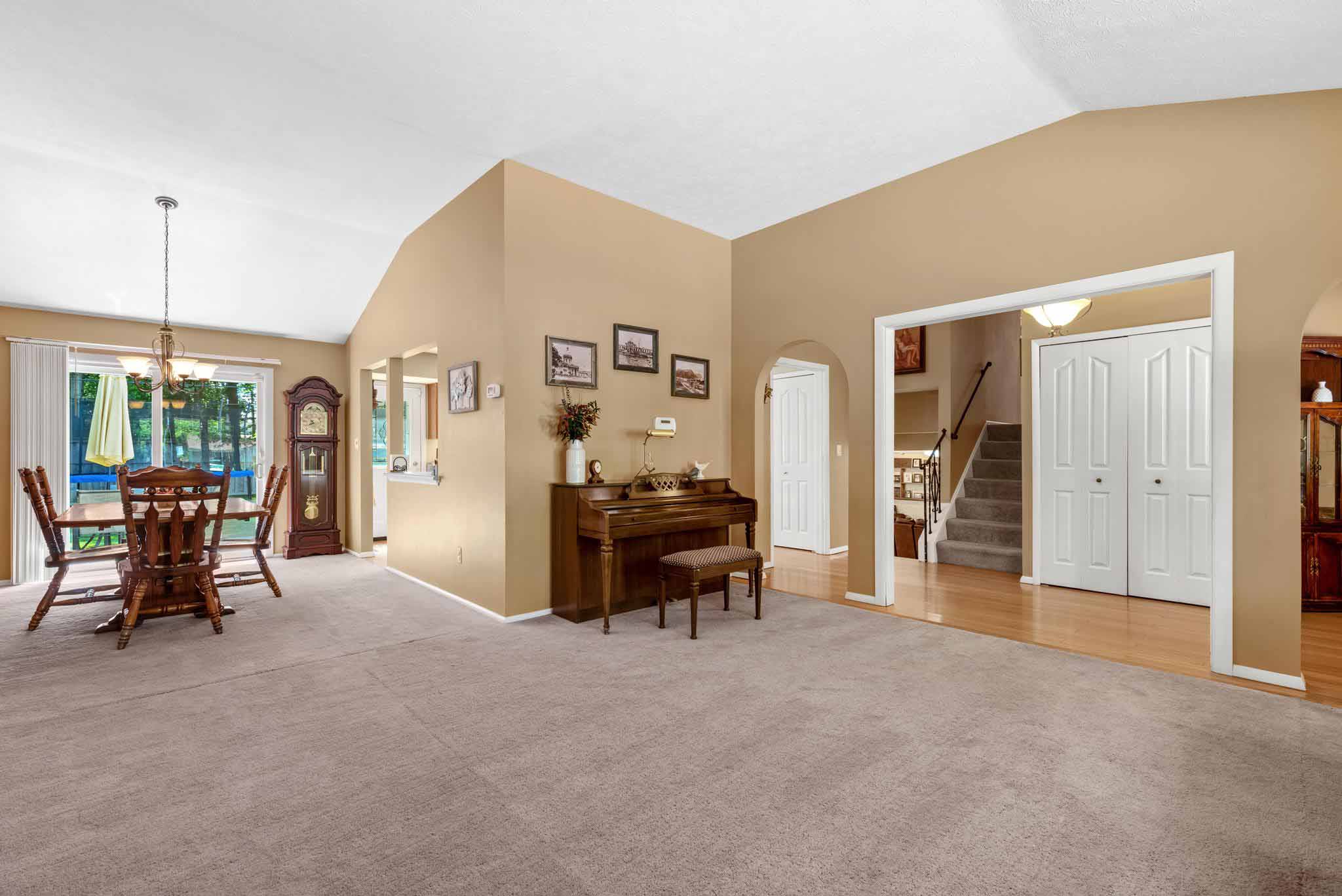 • L-shaped living room with elevated ceilings equipped with a slider off the dining room to the rear patio.