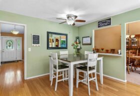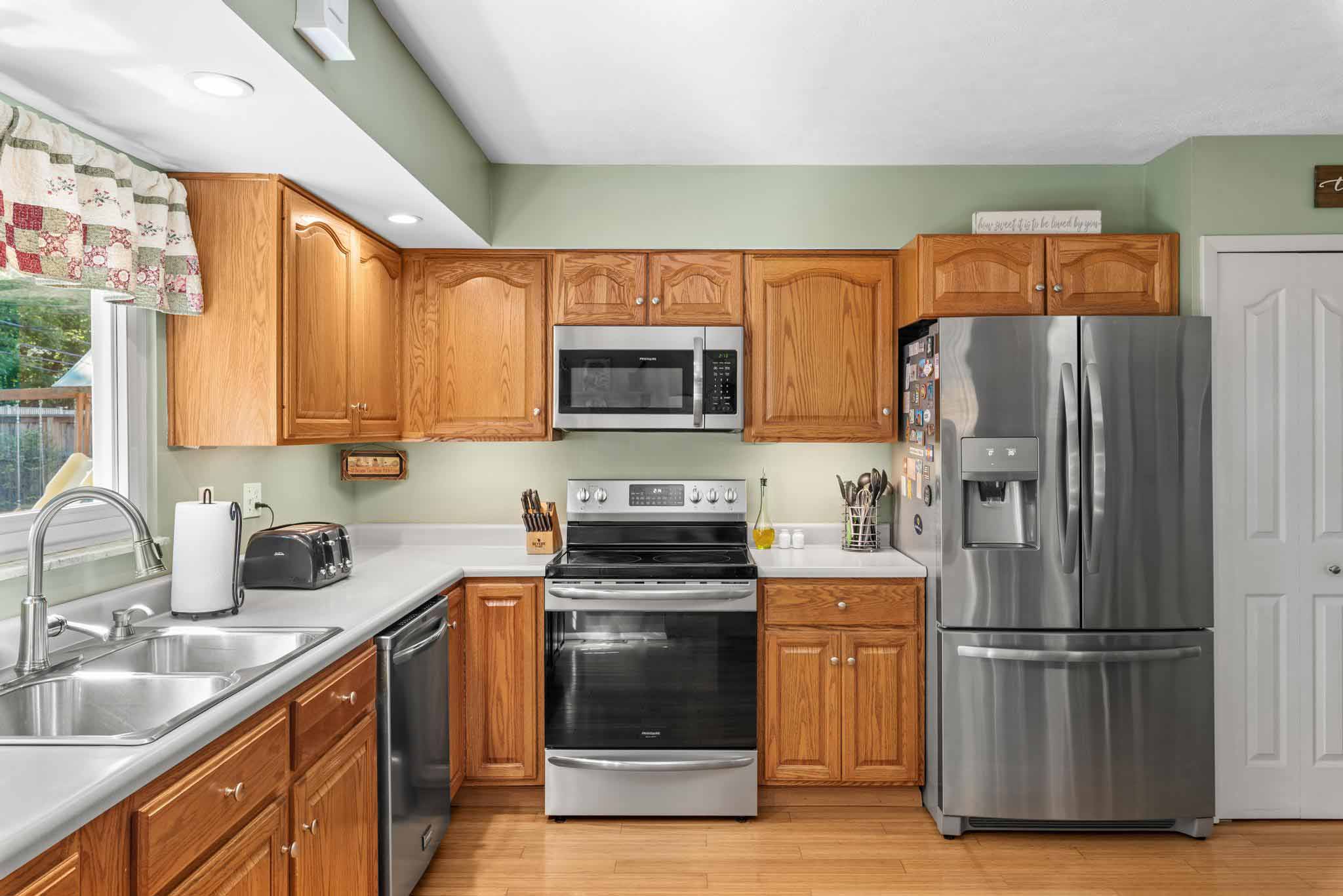• Huge eat-in kitchen with loads of cabinets/countertops, has bamboo hardwood floors, space for an eat-in table & a café-style seating area between the kitchen and dining room.