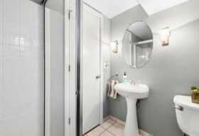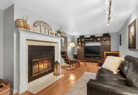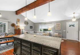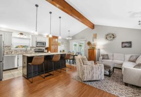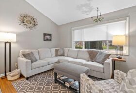 - The main floor features a modern, open space with vaulted ceiling, impeccable vinyl flooring, & updated light fixtures.