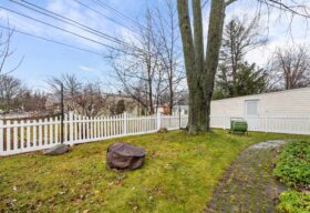 - Outside features include a fenced, side yard area, beautiful, mature plantings, shade trees, and open space.