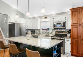 - The kitchen features beautiful cabinetry, granite tops, newer appliances, & a huge granite island w/pendant lighting.