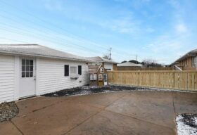 - The backyard is fully fenced, gorgeous stamped concrete patio with decorative curved design and custom designed white fence.