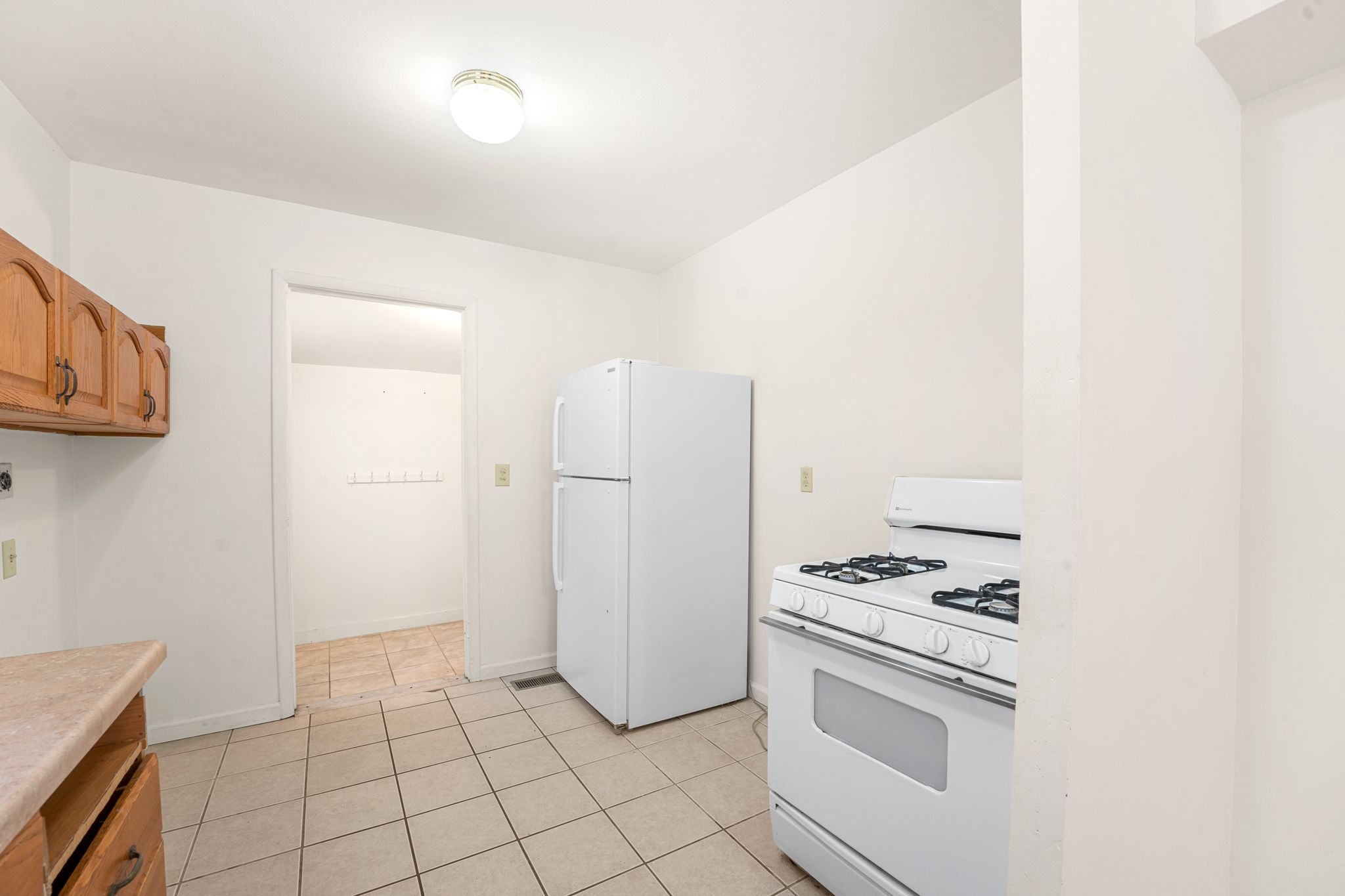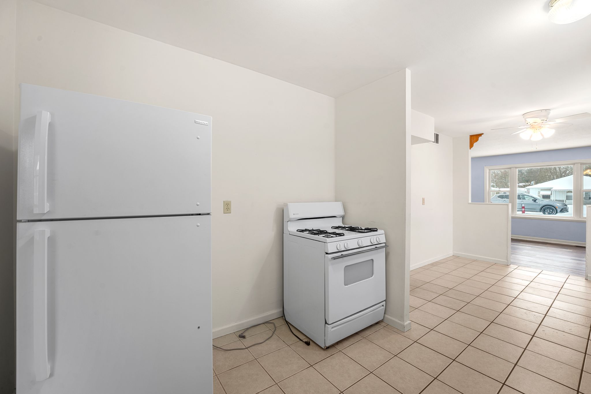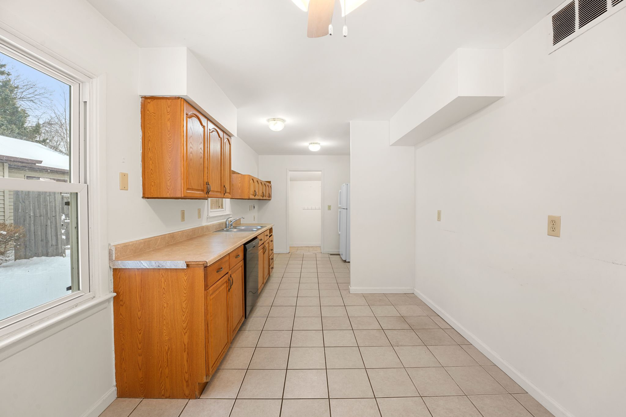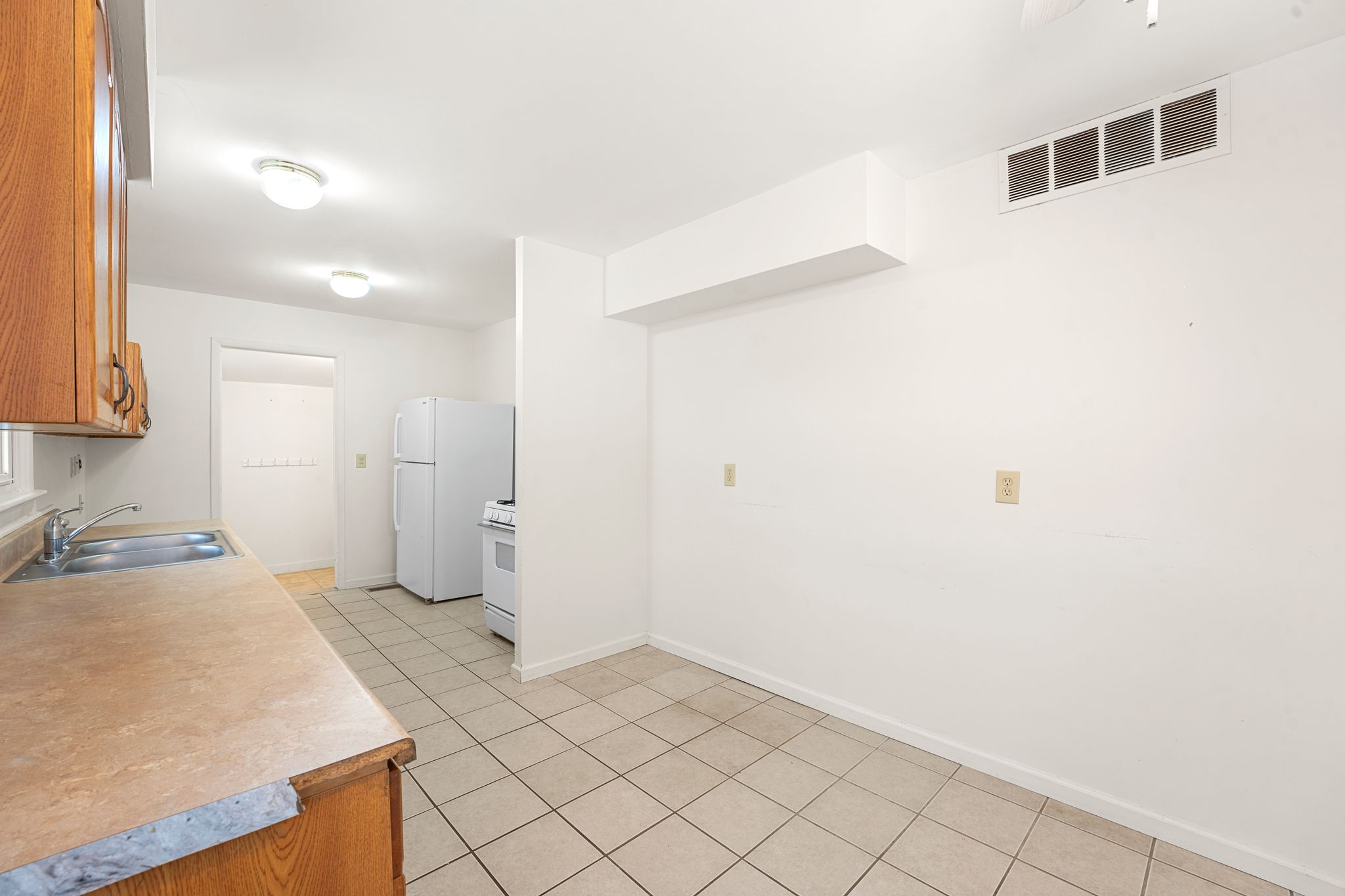 - The kitchen has an abundance of cabinets, a frig, range and dishwasher and an eat-in space at the front.