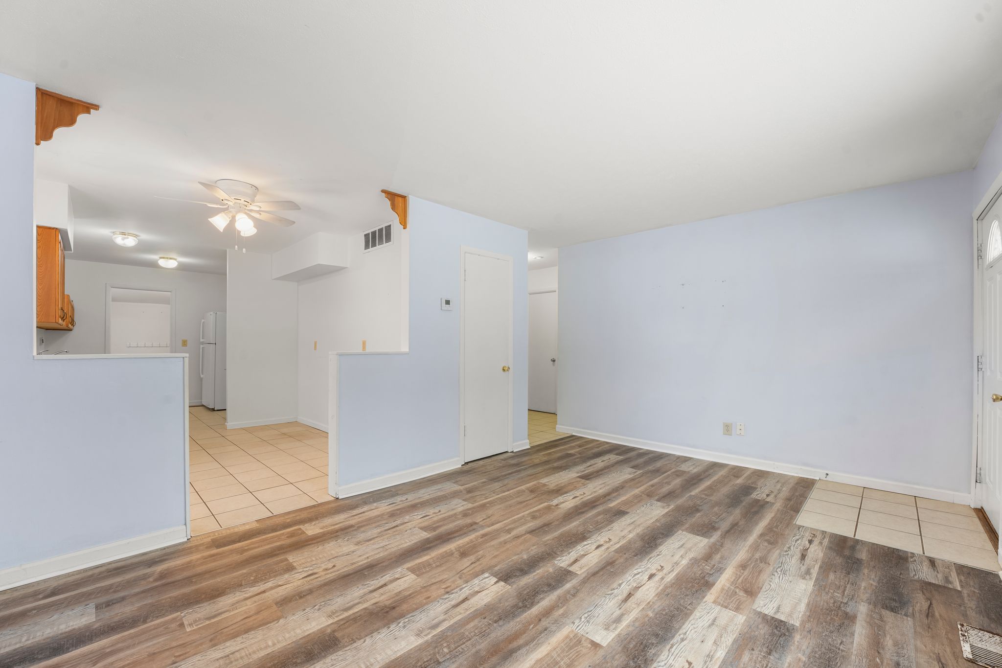 - The living room has Luxury Vinyl Plank flooring, white painted trim and vinyl replacement windows along with a coat closet.