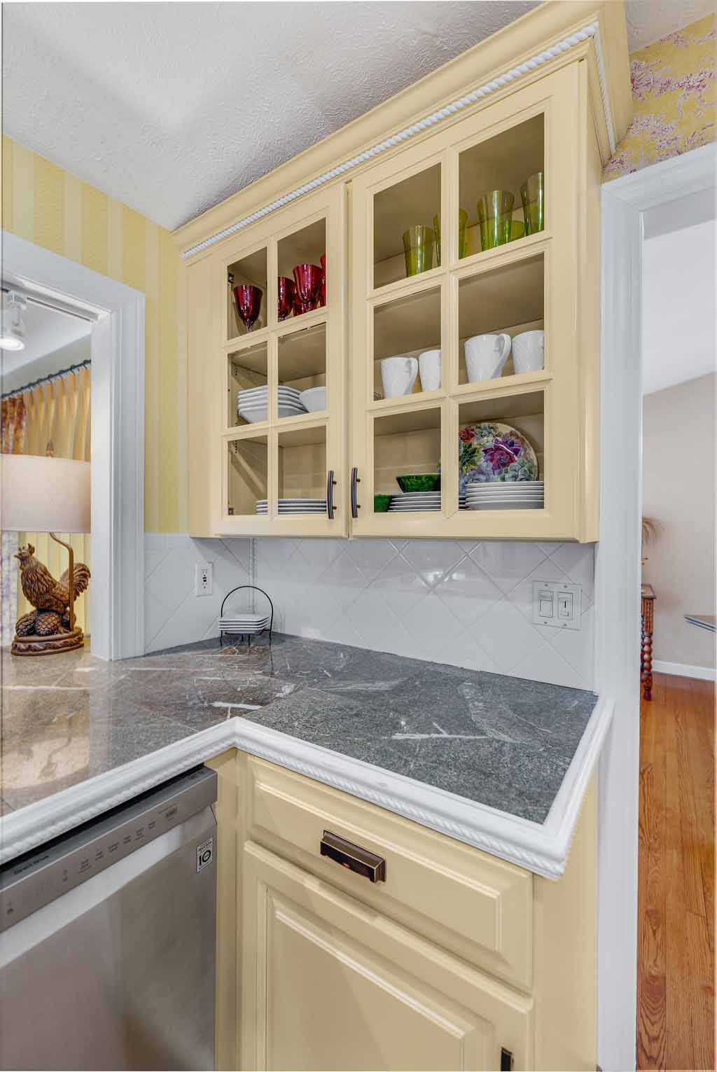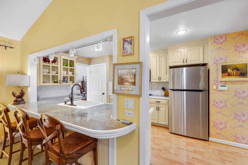 - Renovated French-country kitchen has been renovated, with open café-style seating at the island which joins the family room with a gas-log fireplace.