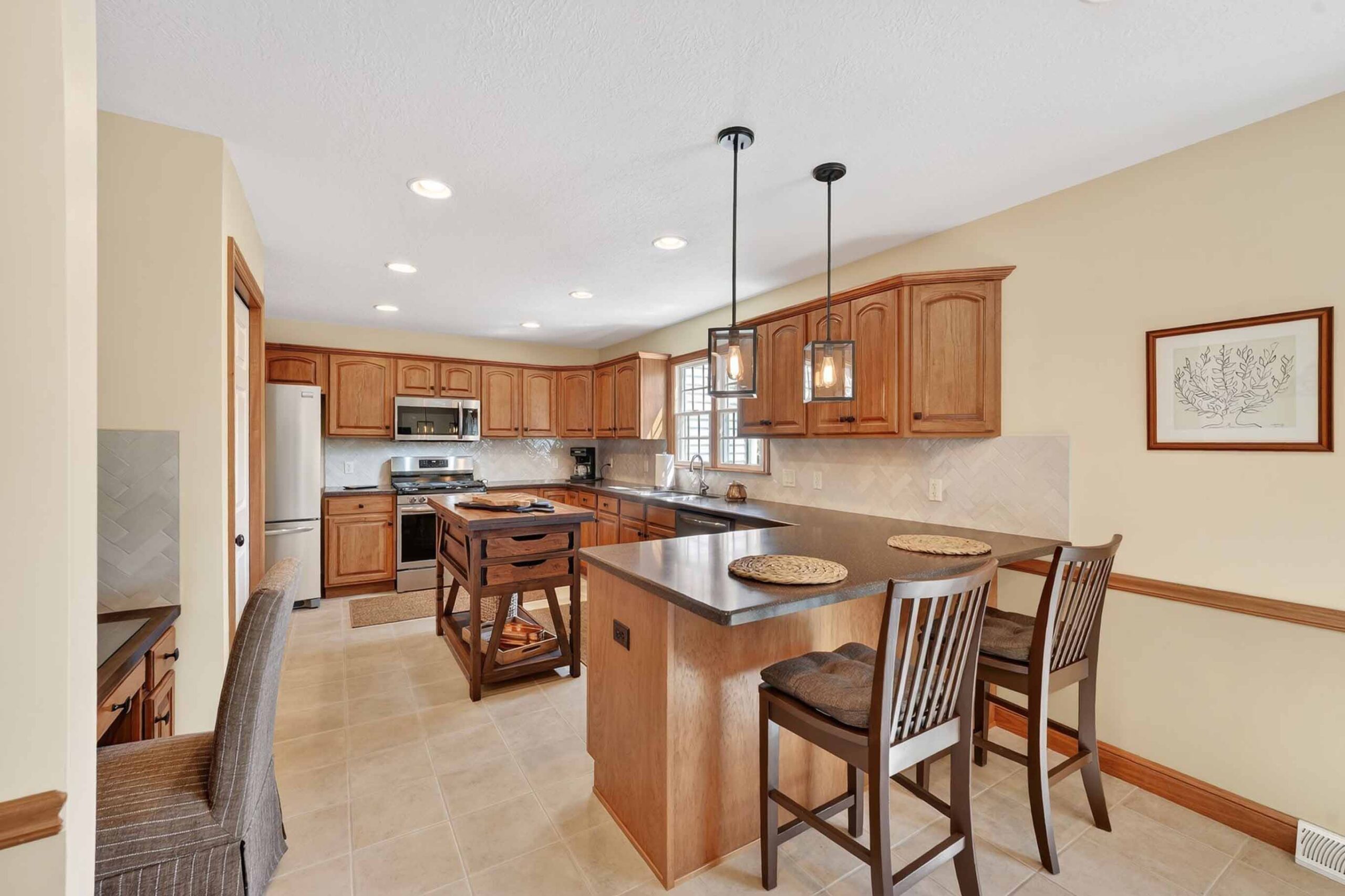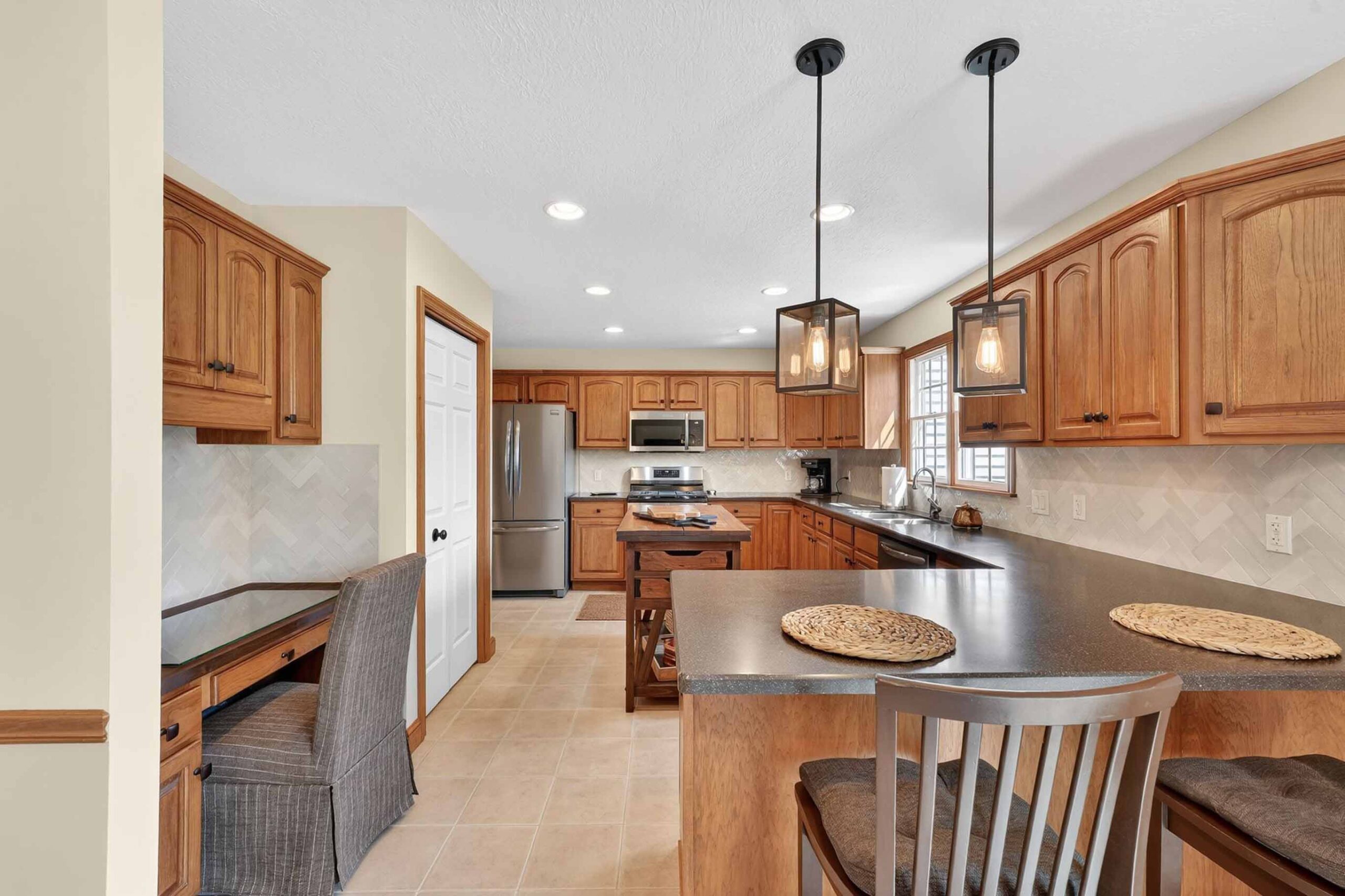 - The oversized kitchen features beautiful hickory cabinets, Hi-Macs solid surface counters w/herringbone pattern tiled backsplash, storage pantry, SS appliances, L-shaped counter with stools, desk area & comfortable table area.