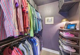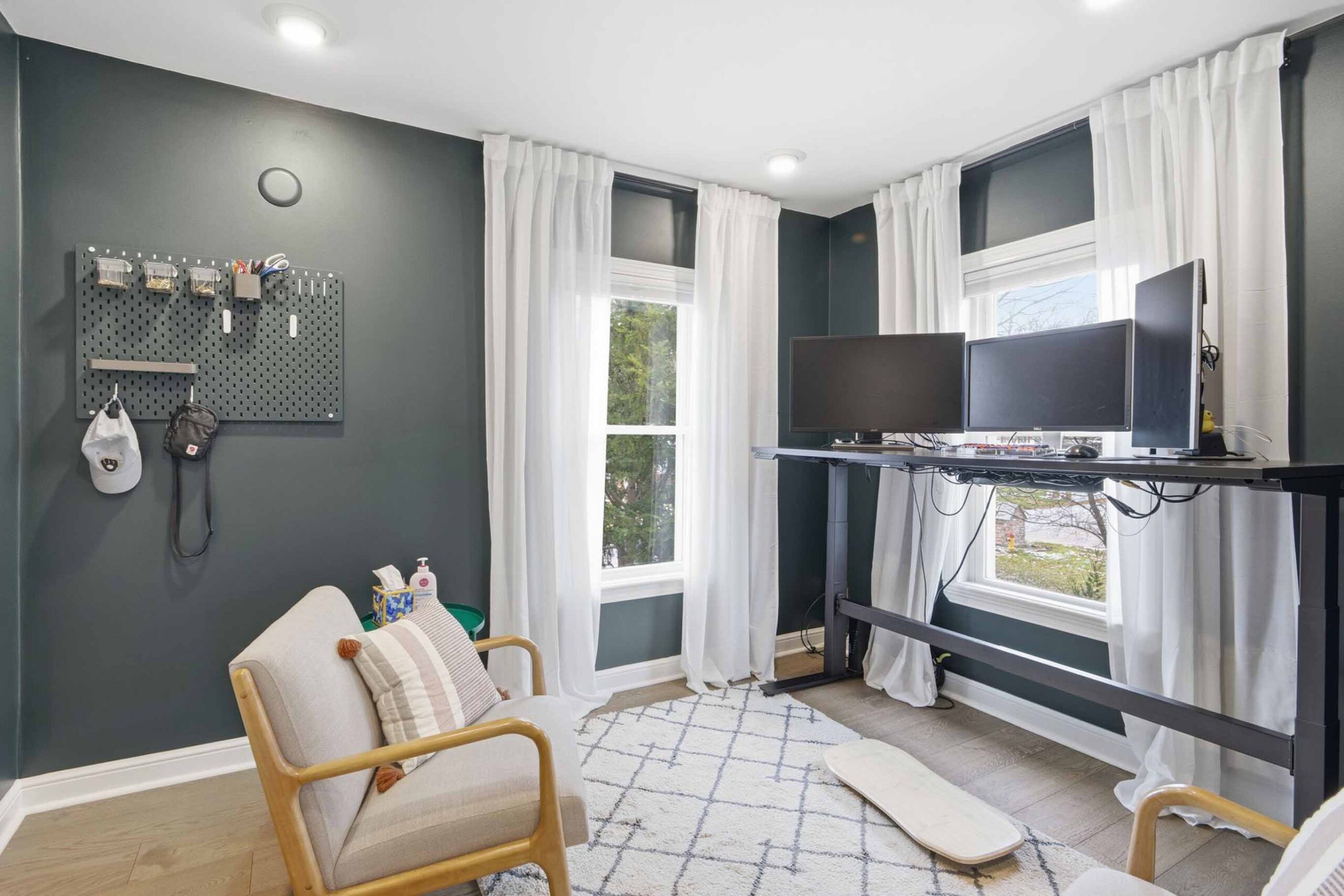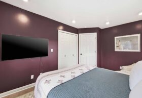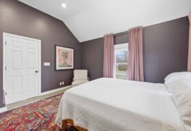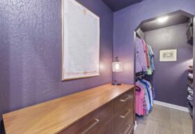 - The upper level presents a primary bedroom w/10’ ceilings, 11’ long walk-in closet w/custom ELFA shelving.