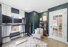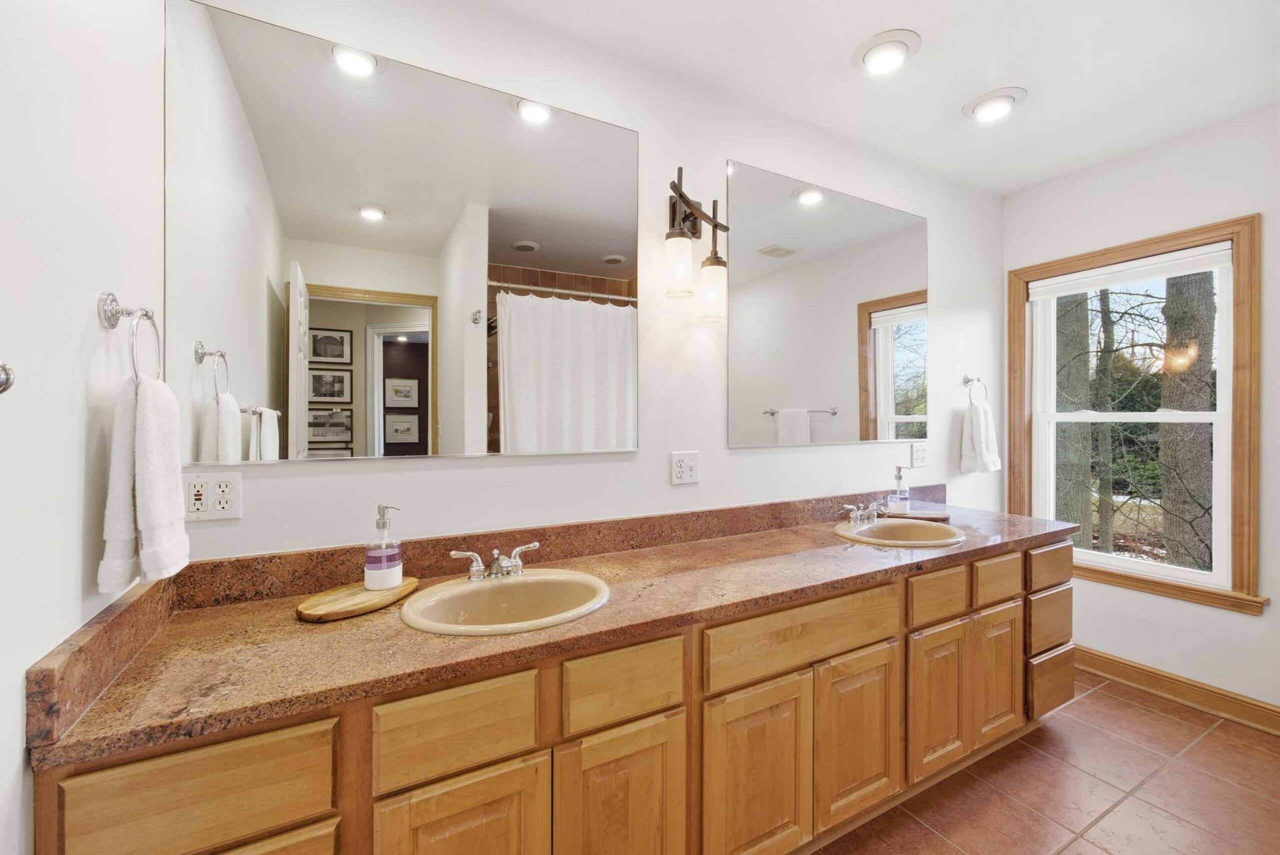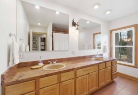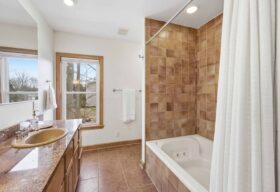- There are two additional bedrooms & a generous, remodeled bathroom w/a deep jetted tub & a 9’ double-bowl vanity w/granite countertop.