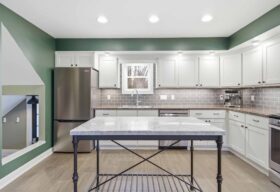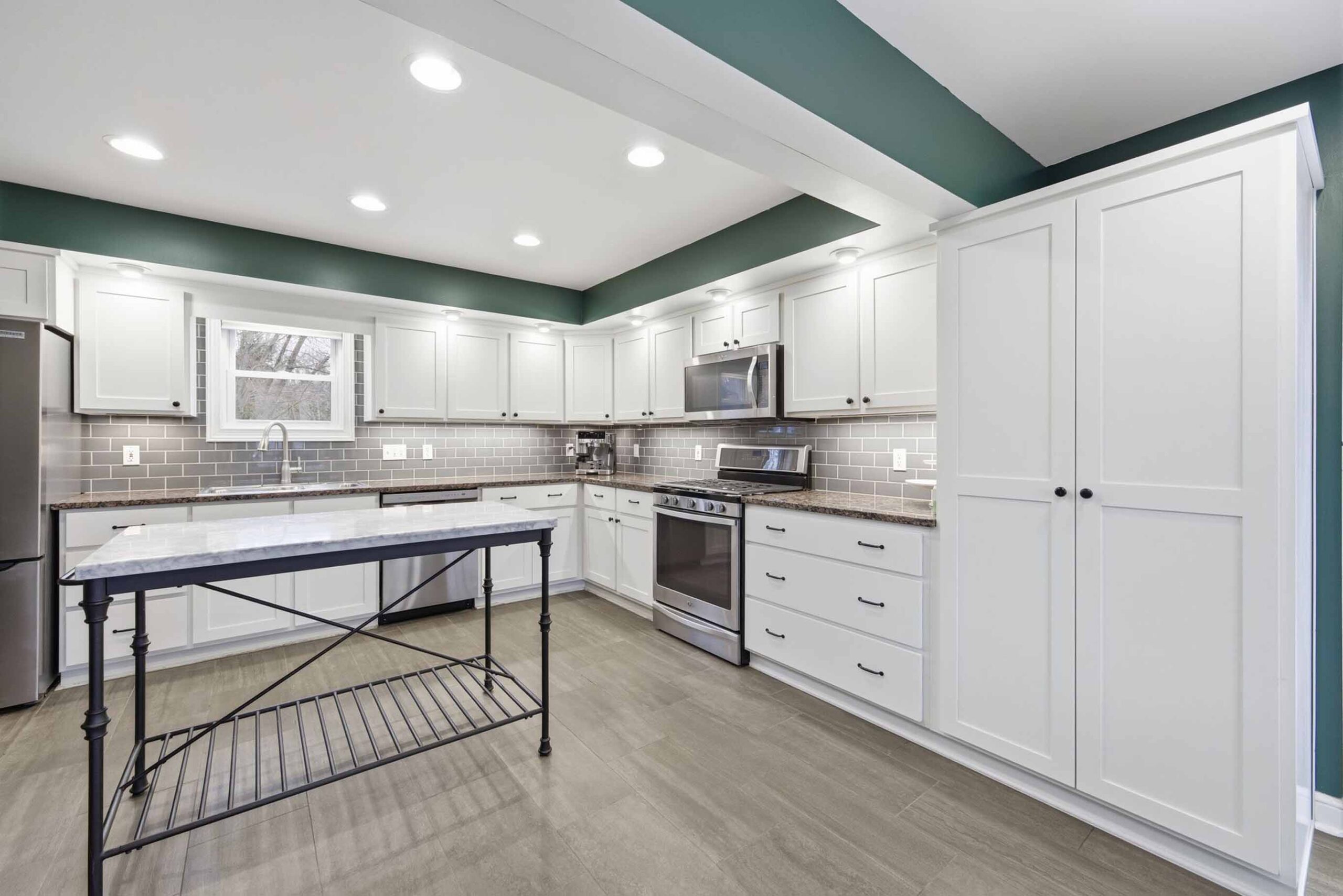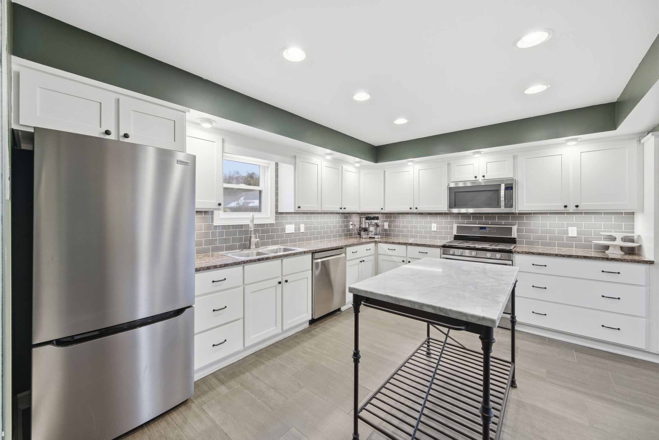 - The remodeled kitchen features soft-close white cabinets w/under cabinet lighting, pantry, tiled backsplash, granite countertops, SS appliances, and a vintage-style island.
