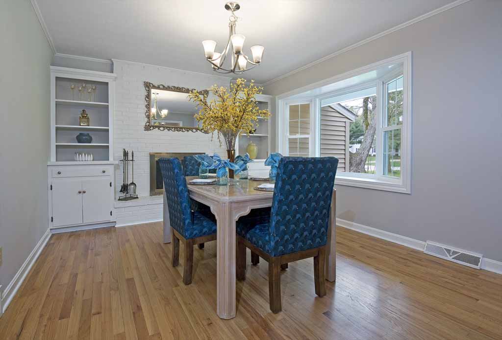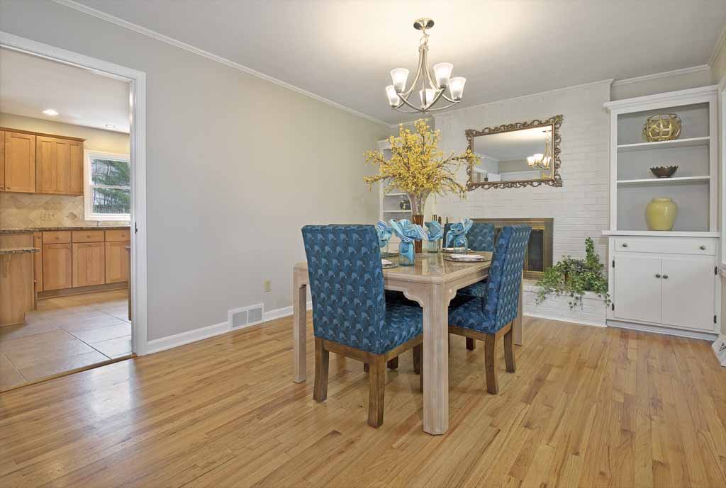 - The main level is a delight w/a cozy dining room with a woodburning fireplace, brick accent wall, built-ins, new light fixture & gorgeous hardwood flooring.