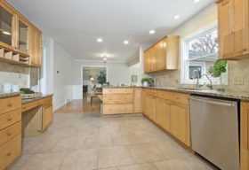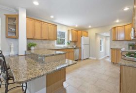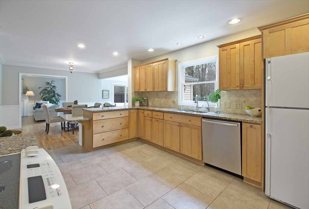 - Remodeled kitchen with maple cabinets, loads of granite countertops, ceramic backsplash, recessed lighting, oversized ceramic flooring, peninsula seating, & desk area.