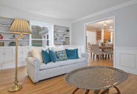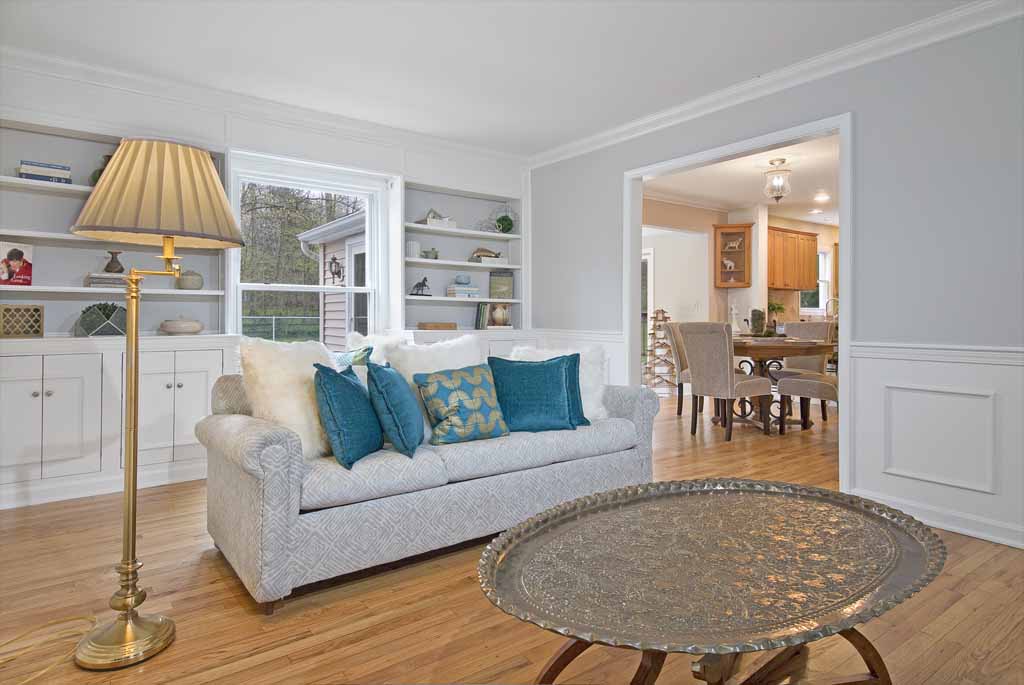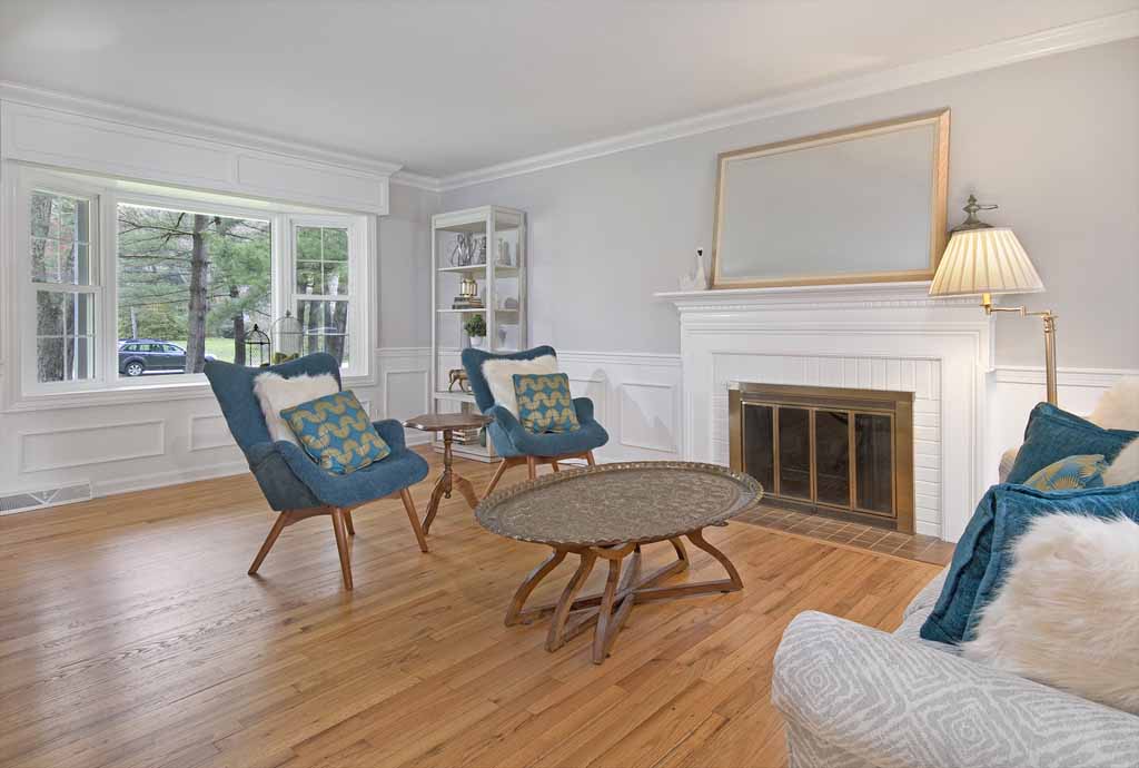 - The living room spans the entire left side of the home & also has pristine hardwood flooring, a 2nd woodburning fireplace w/a custom mantel surround, picture mold, chair rail, built-ins + bookshelves, & crown molding.