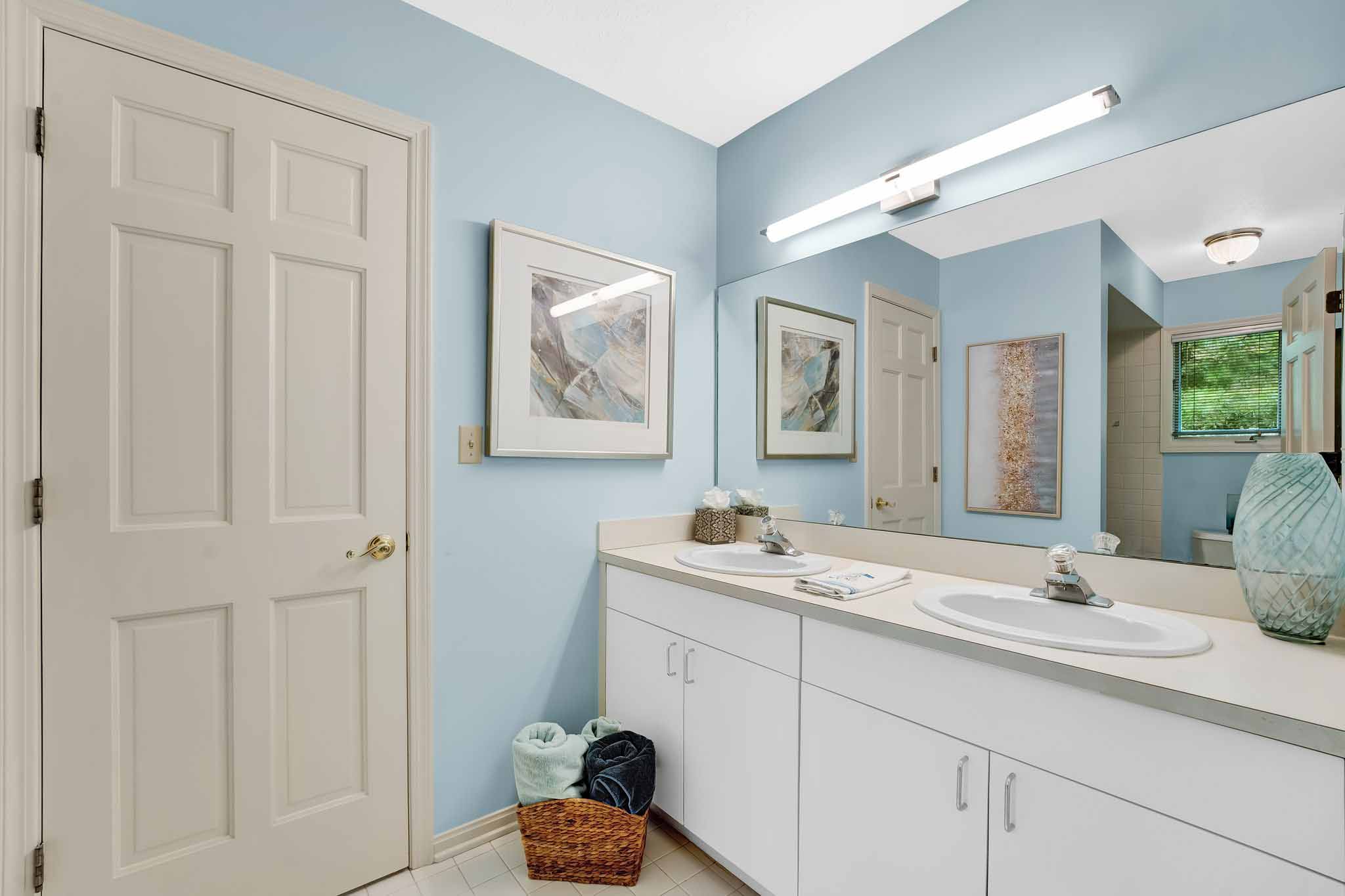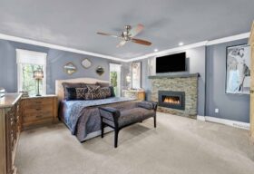 • The main level primary bedroom is a luxurious private retreat w/rear wooded views, gas fireplace w/ beautiful stones, separate walk-in closet, jet tub, separate shower, double sinks, and generous linen closet.