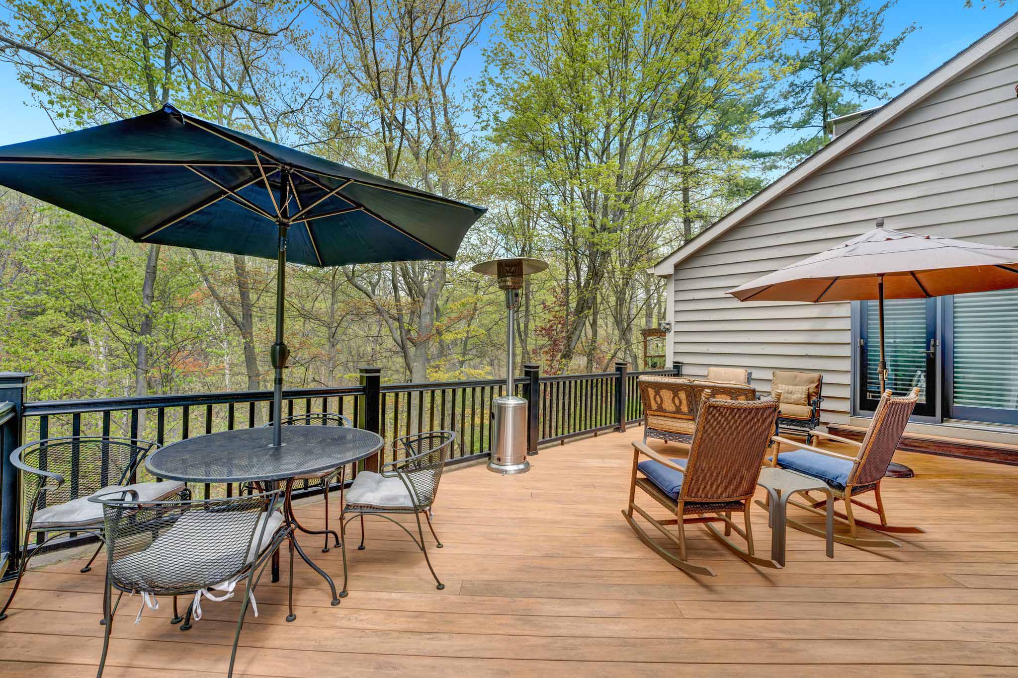 • A dramatic, light-filled 2-story foyer overlooks the warm, expansive great room with floor-to-ceiling brick, 2-sided gas log fireplace and the private wooded rear yard with a wonderful composite deck and adjacent stone patio.