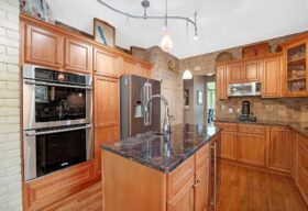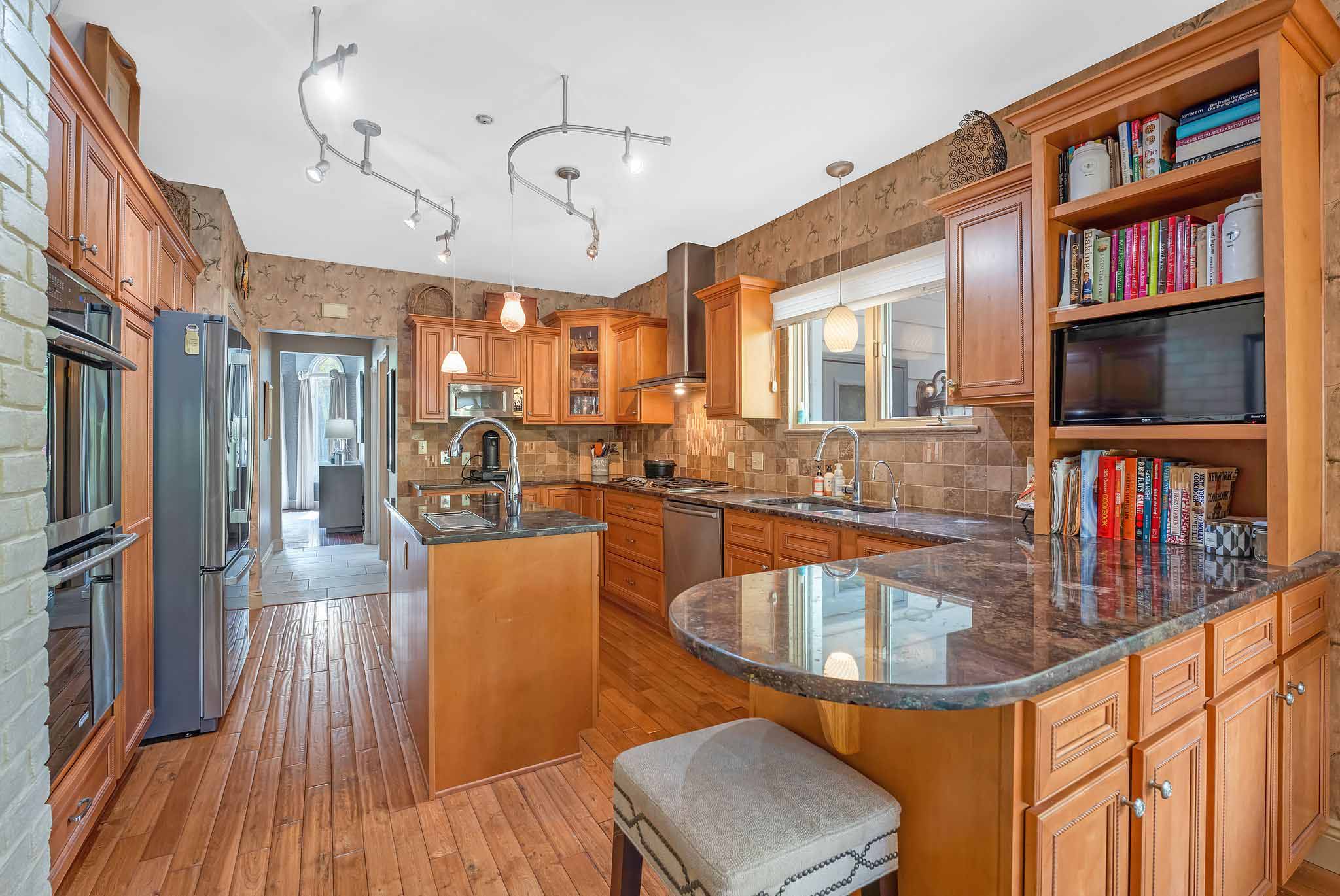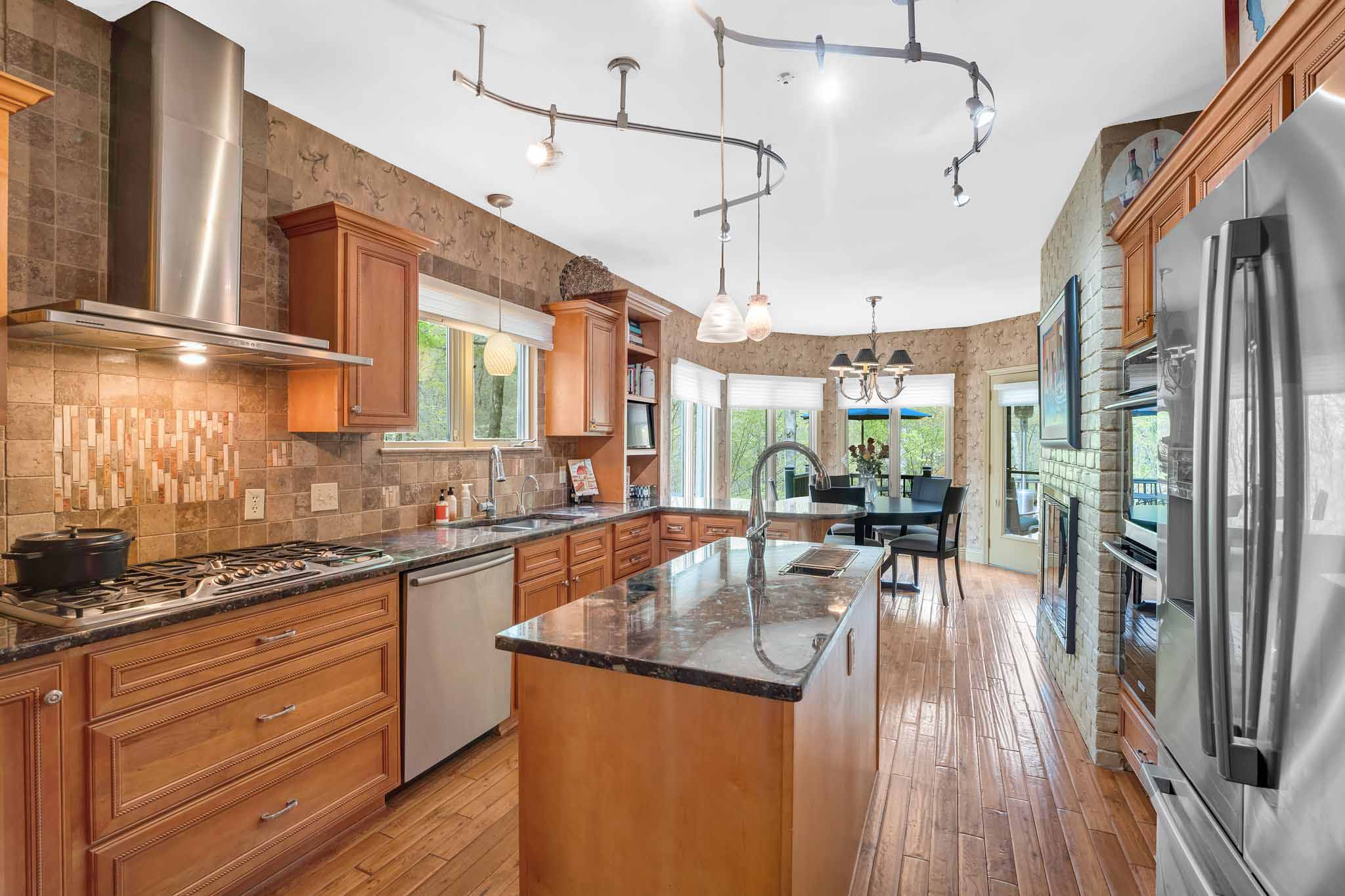 • The bright gourmet kitchen boasts high-end SS appliances with double wall ovens, gas cooktop, granite countertops, island w/prep sink, and spacious table area w/access to deck.