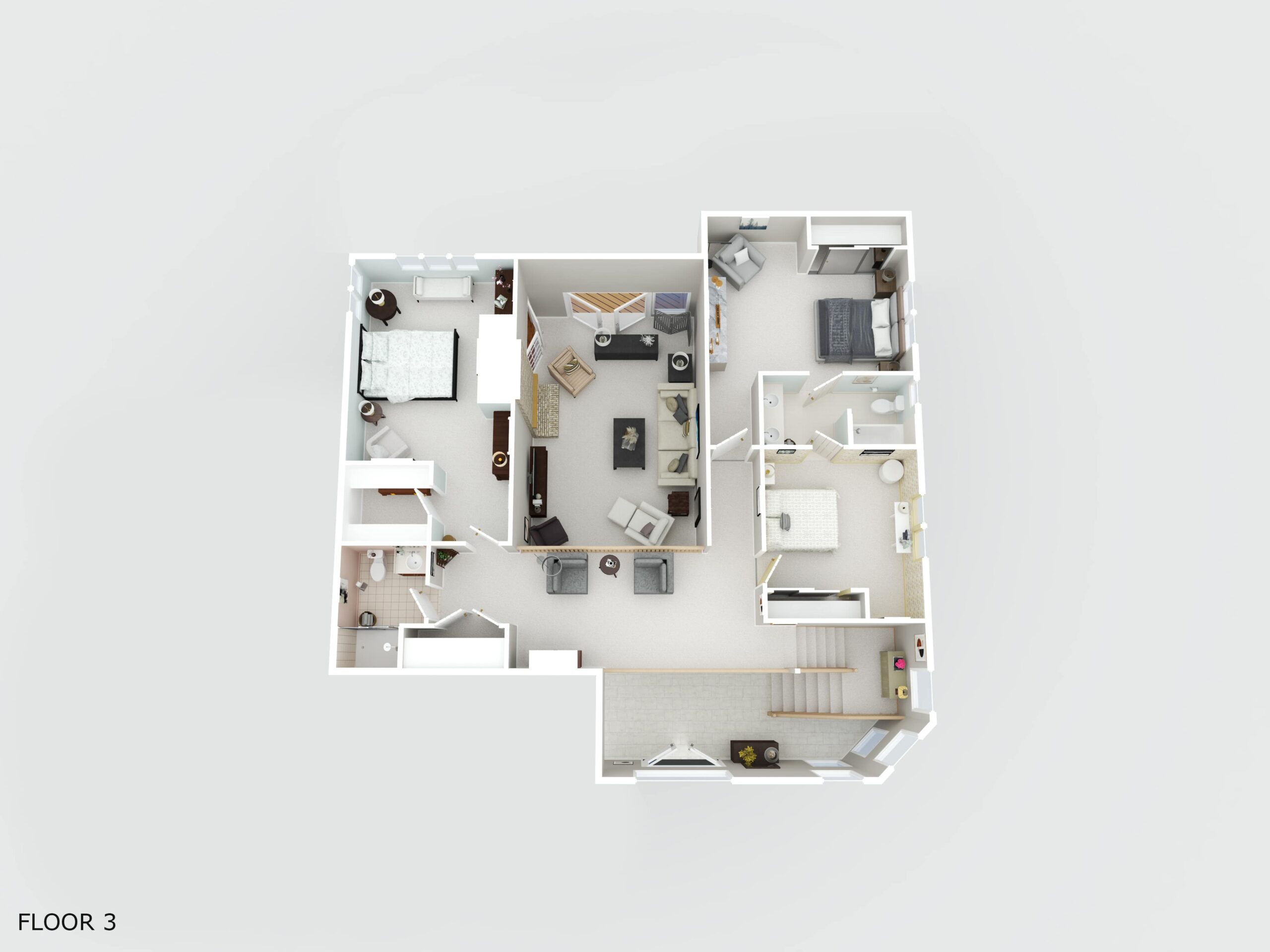 • A charming side staircase with 2-story windows leads to the upper level which presents a generous open loft area, two bedrooms w/Jack-n-Jill bath, and a third bedroom with a full bath.