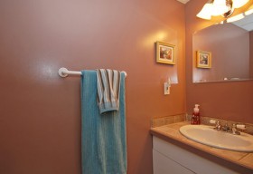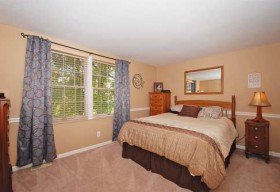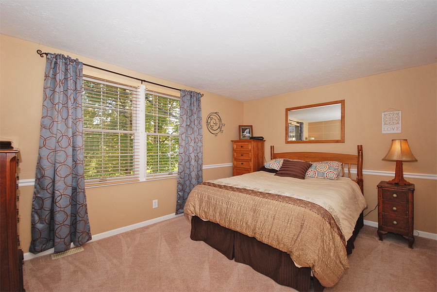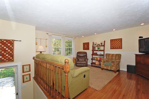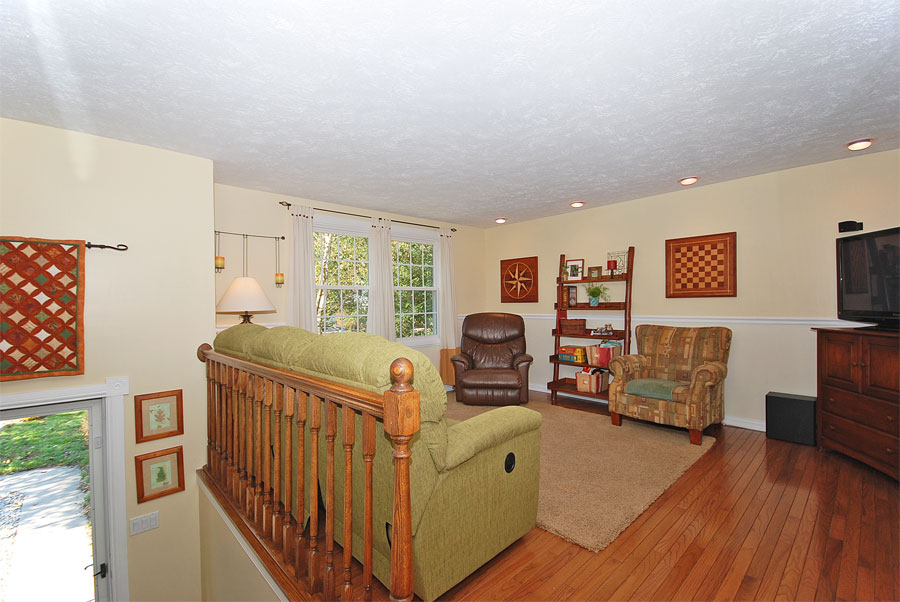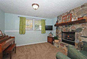 - Lower level is light-filled and has a gas log fireplace with a stone hearth