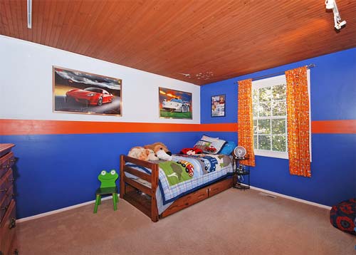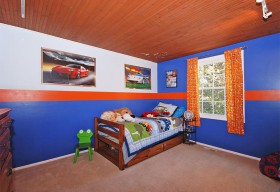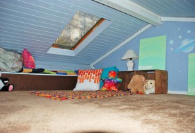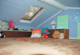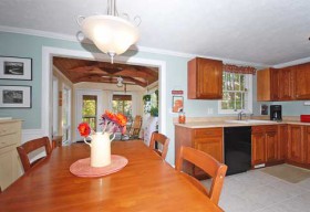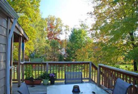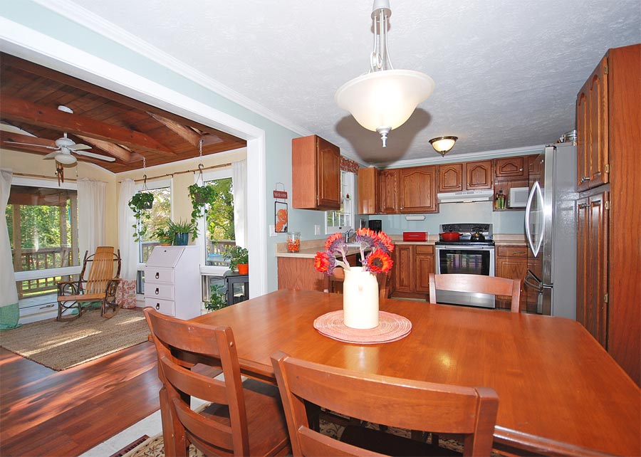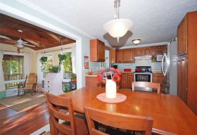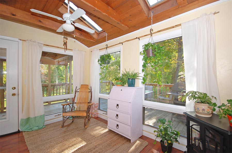 - Fabulous light-filled sun room with beamed, vaulted, wood-planked ceiling with skylights and ceiling fan. Overlooks the deck and steps out into a smaller covered rear porch
